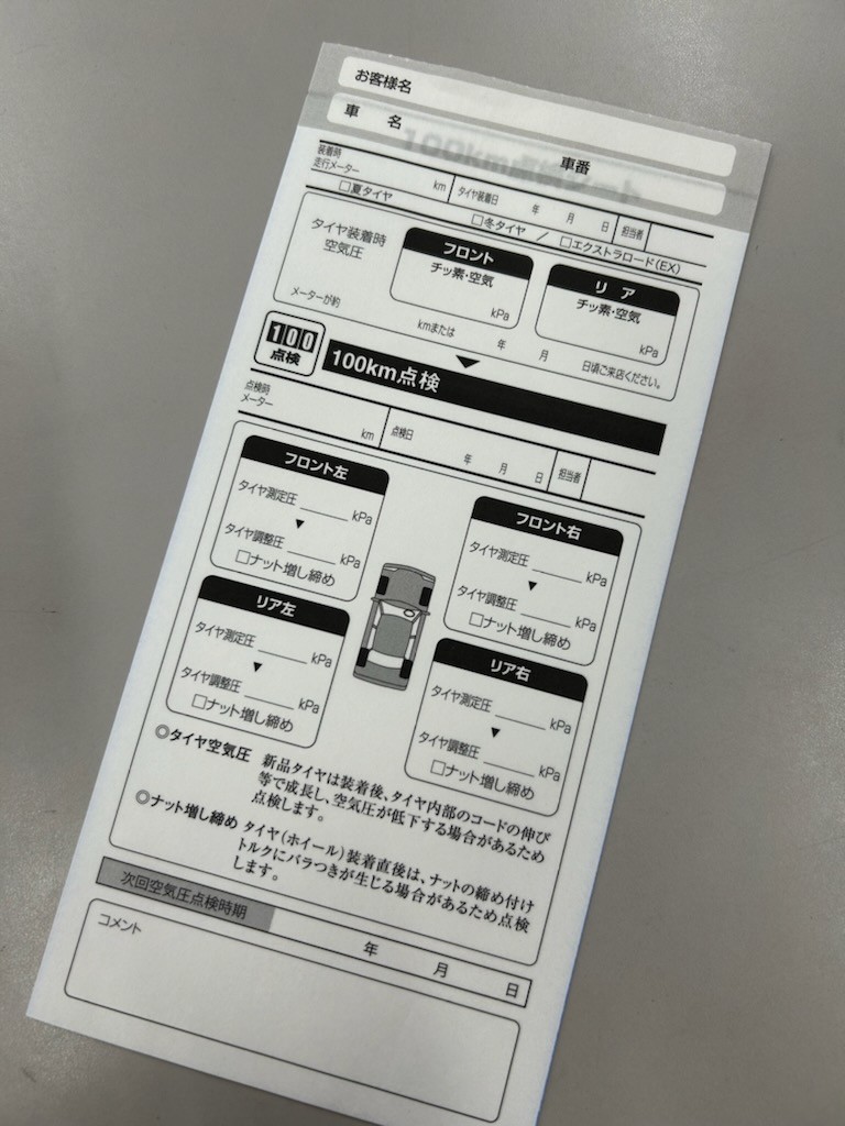 100Km点検では空気圧の点検とナットの増し締めをさせていただき、点検結果を記入してお返しします。