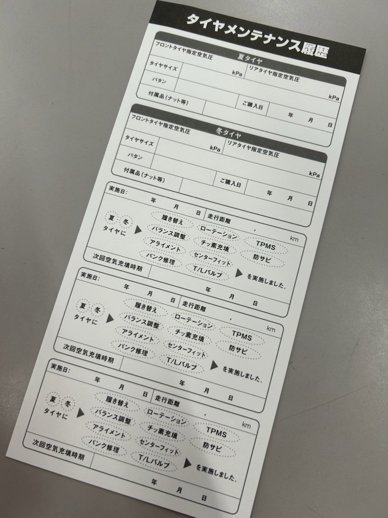 タイヤメンテナンス履歴を記入する紙が入っています。