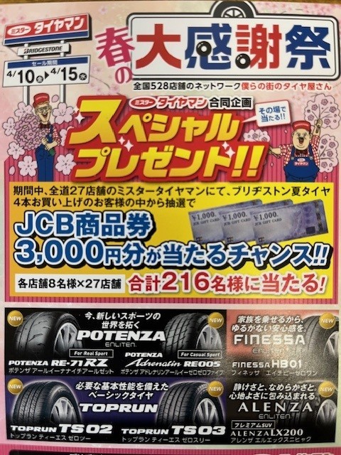 ブリヂストンタイヤ4本購入でオリヂナルBOXティッシュ1箱プレゼント!