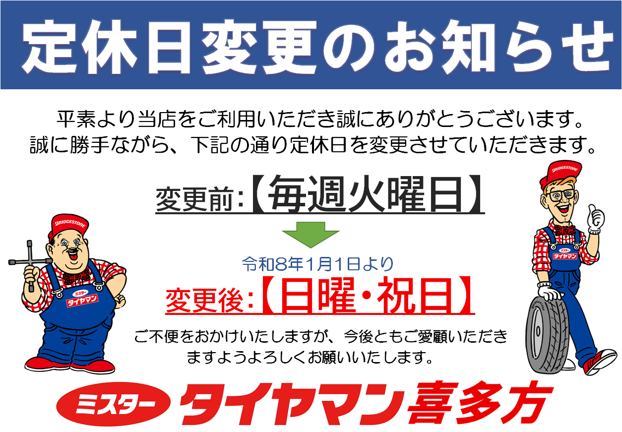 ミスタータイヤマン喜多方 定休日変更のお知らせ!!