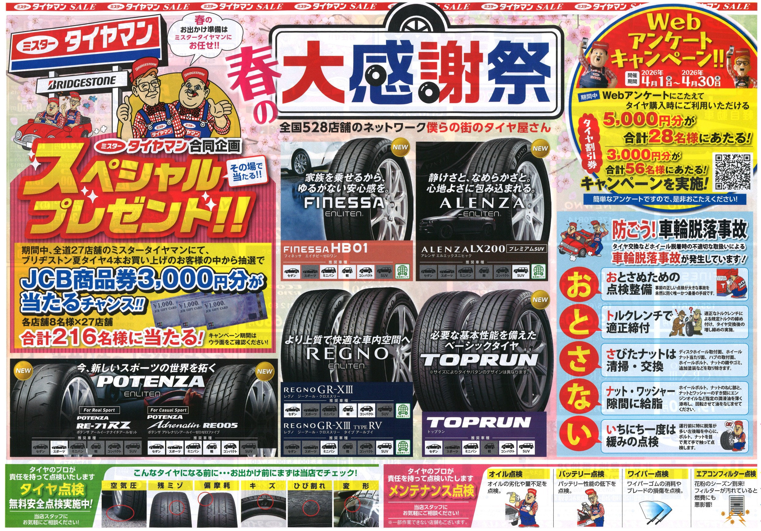春の大感謝祭!!のご案内 2026年4月8日 こんにちは! 春の大感謝祭の詳細お伝えします(*^。^*) 今回、夏タイヤ4本ご購入のお客様にくじを引いて1等が出ると3000円分のJCB商品券をプレゼント!! ぜひ、ご購入の検討を(^^♪