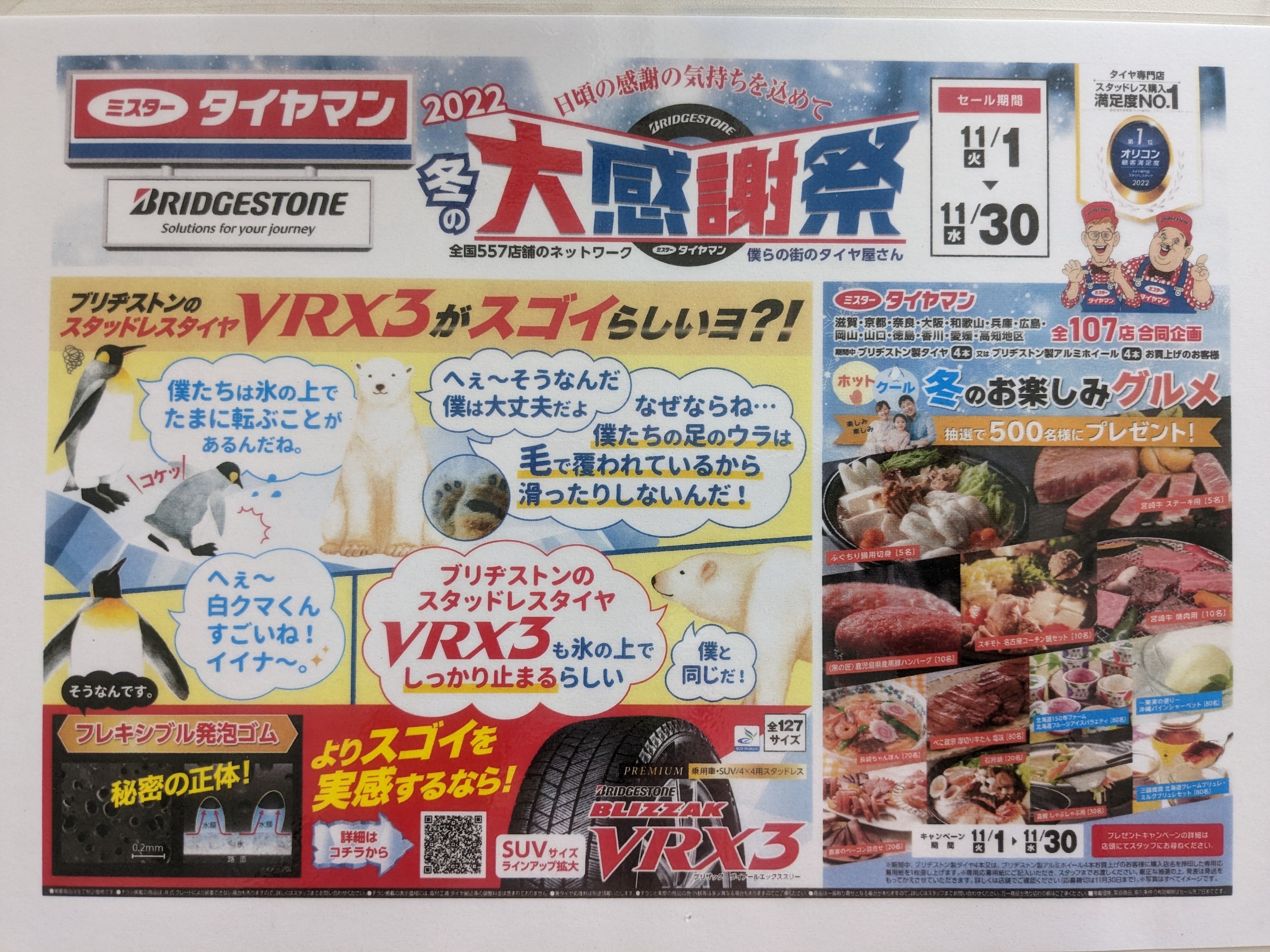 冬の大感謝祭継続のお知らせ 2022年11月20日 2022年11月30日まで、大感謝祭を継続しています! タイヤ、バッテリー、ワイパーをお買い得価格でご奉仕する他 ブリヂストン製タイヤ・アルミホイール4本お買い上げのお客様に抽選で冬のお楽しみグルメをプレゼント! 是非この機会にご来店下さい!