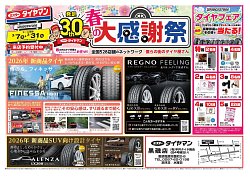 皆さんこんにちは、春の大感謝祭が3月7日~3月31日まで開催しております。 ブリヂストンタイヤの専門店、タイヤ選びのプロが居る当店でお買い求めてはいかがでしょうか? 皆様のご来店スタッフ一同心よりお待ちしております。