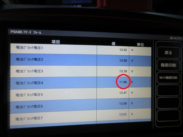 4番ブロックだけ電圧低下していますね。バッテリーの交換です。20万円超えの見積もりでした。