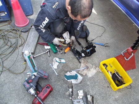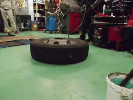 夕方 四トン トラックのパンク修理 でも穴が、大きいので、みんな離れて、空気充填 作業完了しましたよ。