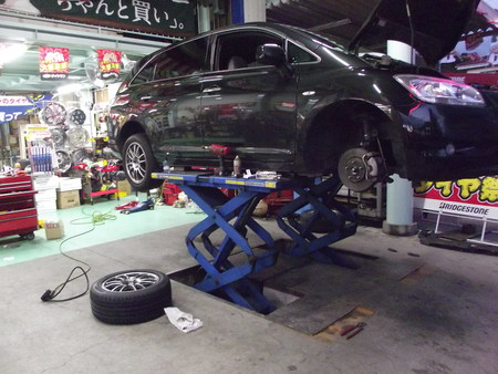 夕方に マークXジオのタイヤ交換S001に前後ディクセルのパット交換