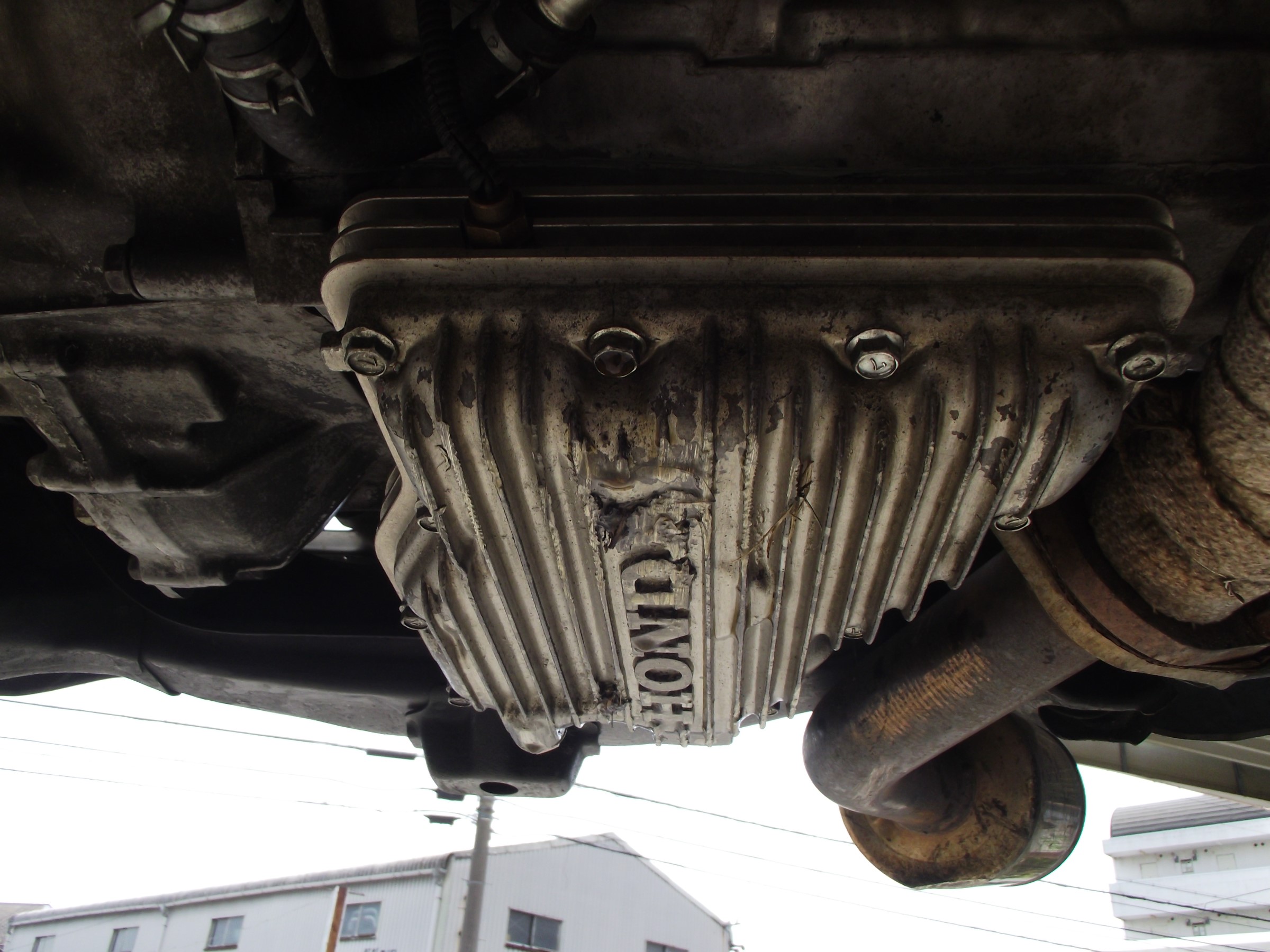 先日の耐久レースにてコースアウトのダメージは、オイルパンが、割れていました。