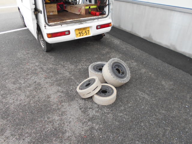 本日は、お取引先のリフトのタイヤ交換ですが。