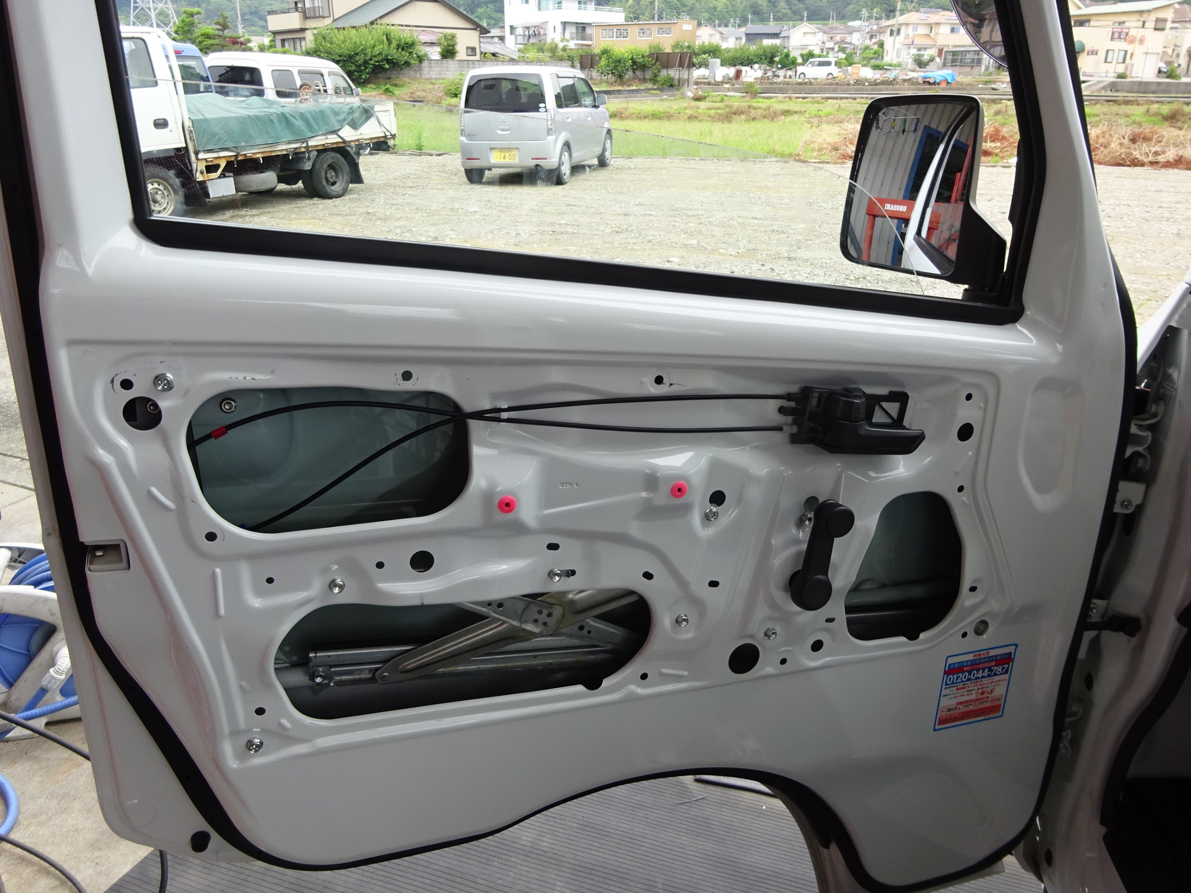 こっちは、草刈機で、飛ばされた小石で、ドアガラスが、砕けたので、交換です。