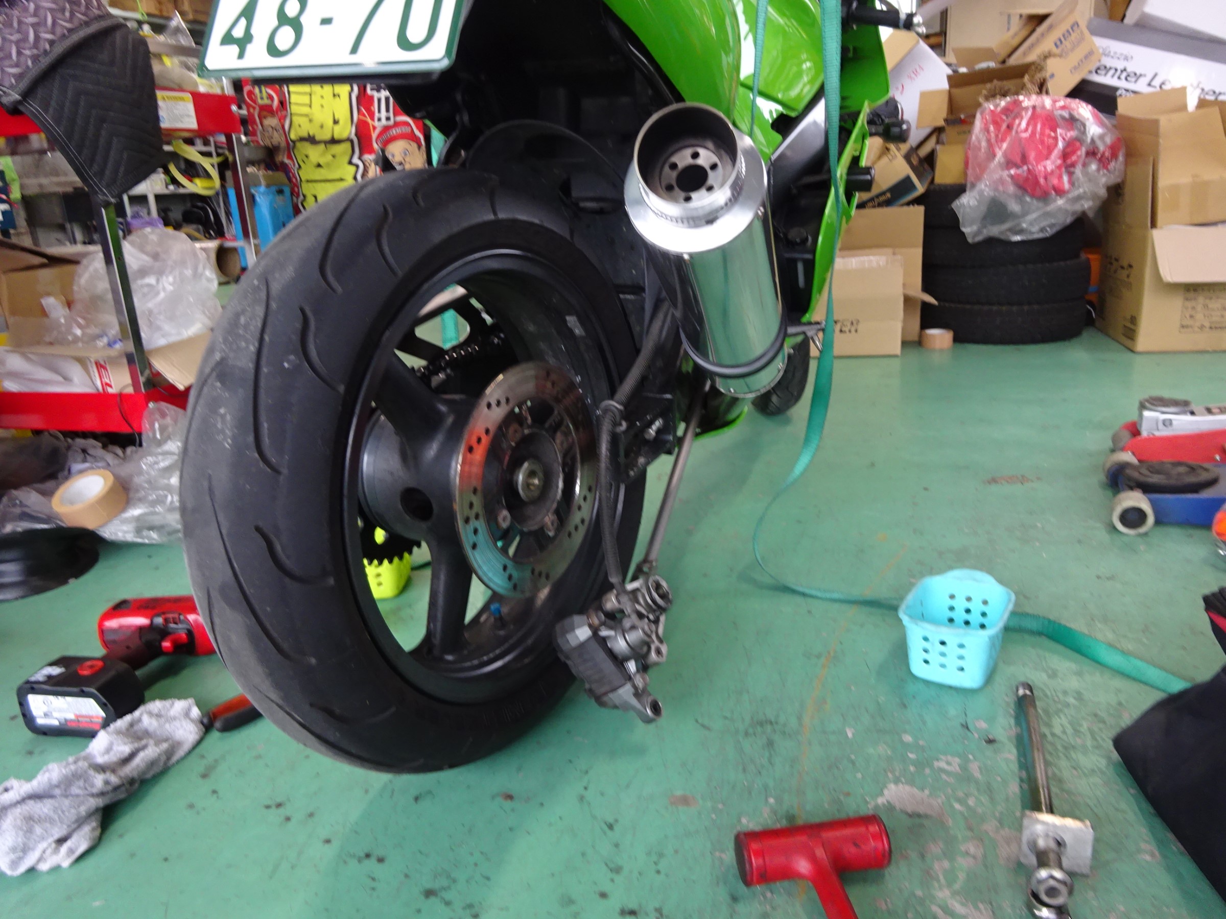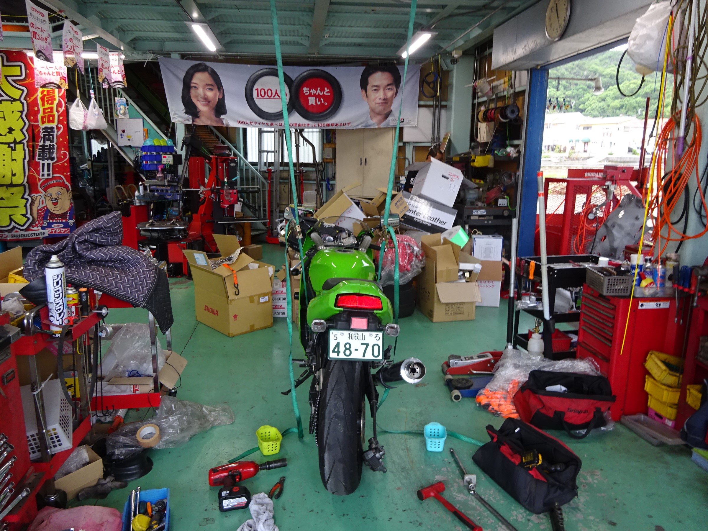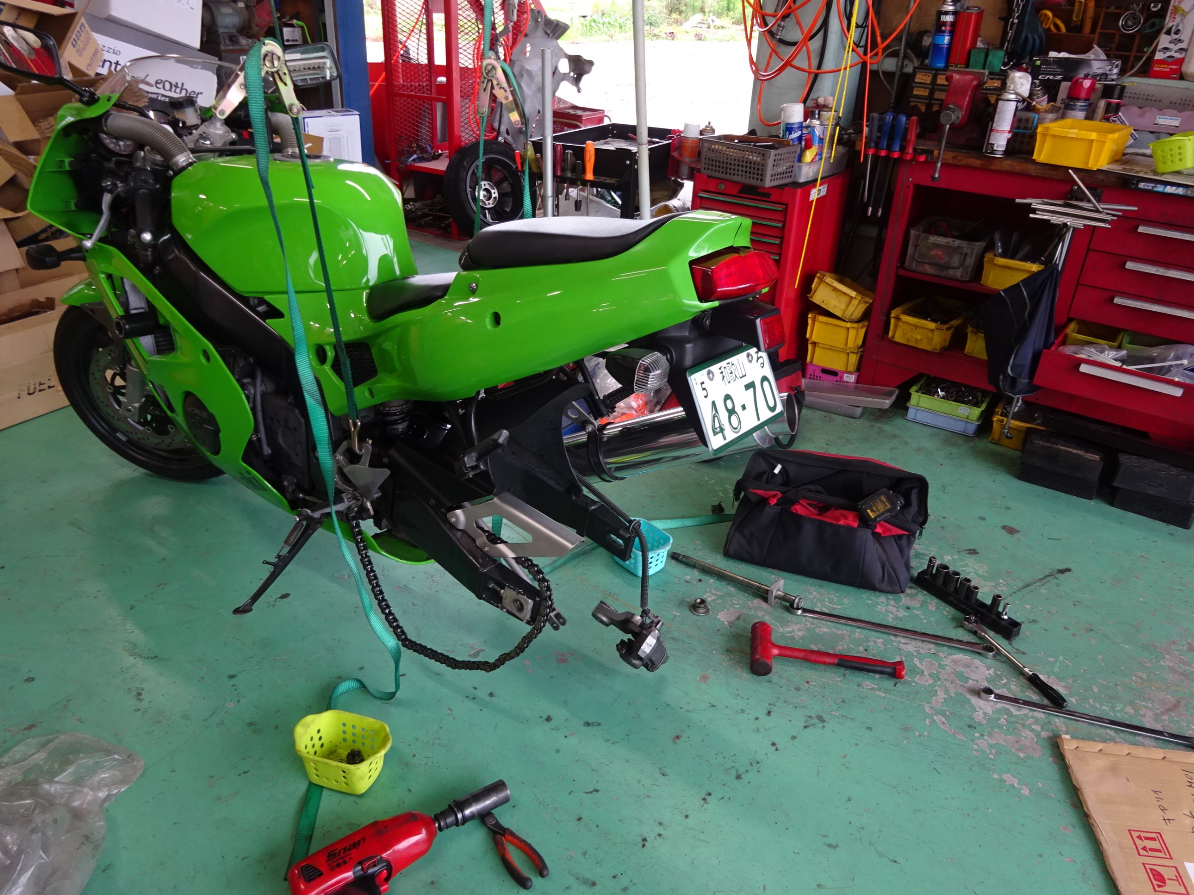 いつもはホイストで吊るのですが、一本だと安定が悪いので、二本のタイダウンにて吊るします。