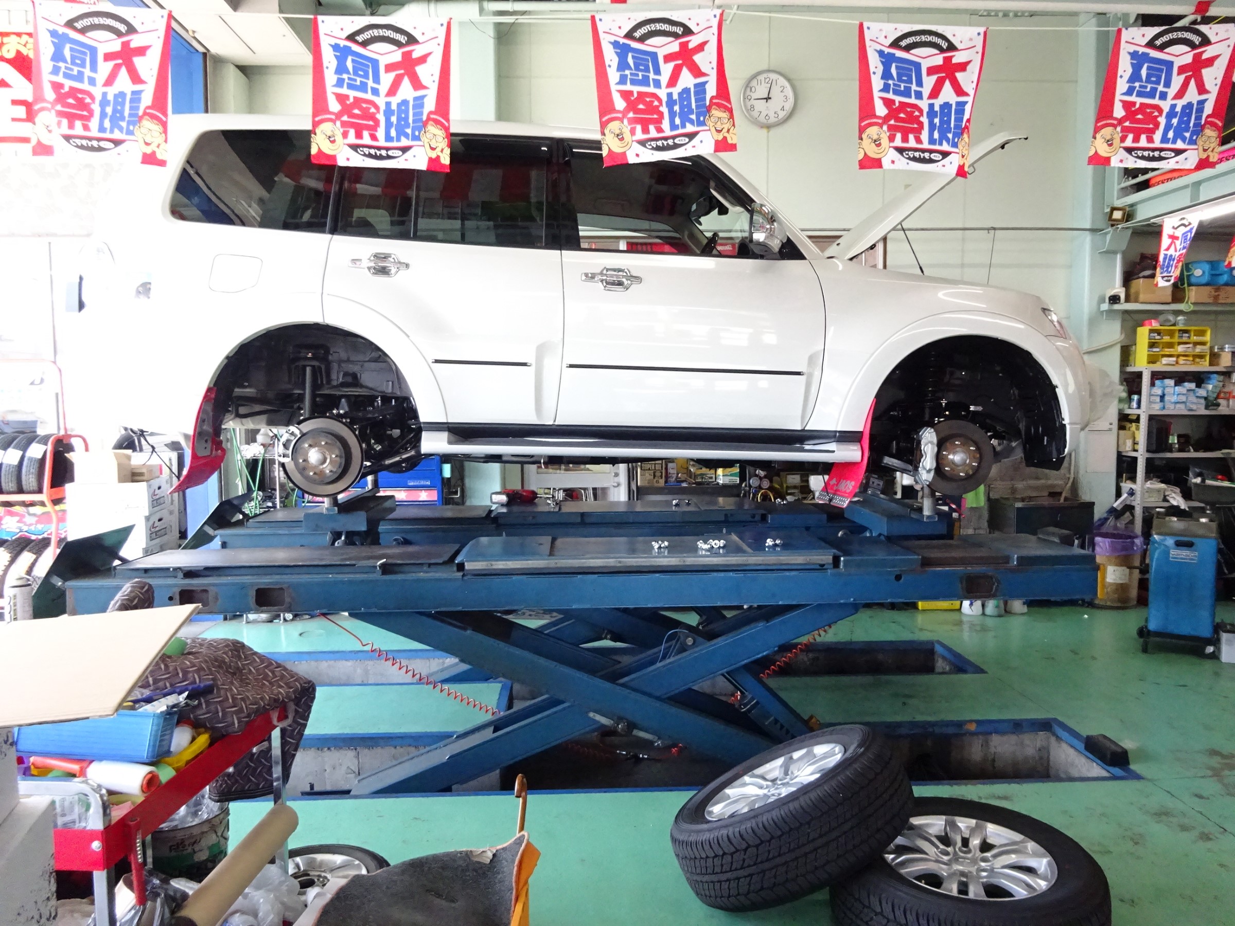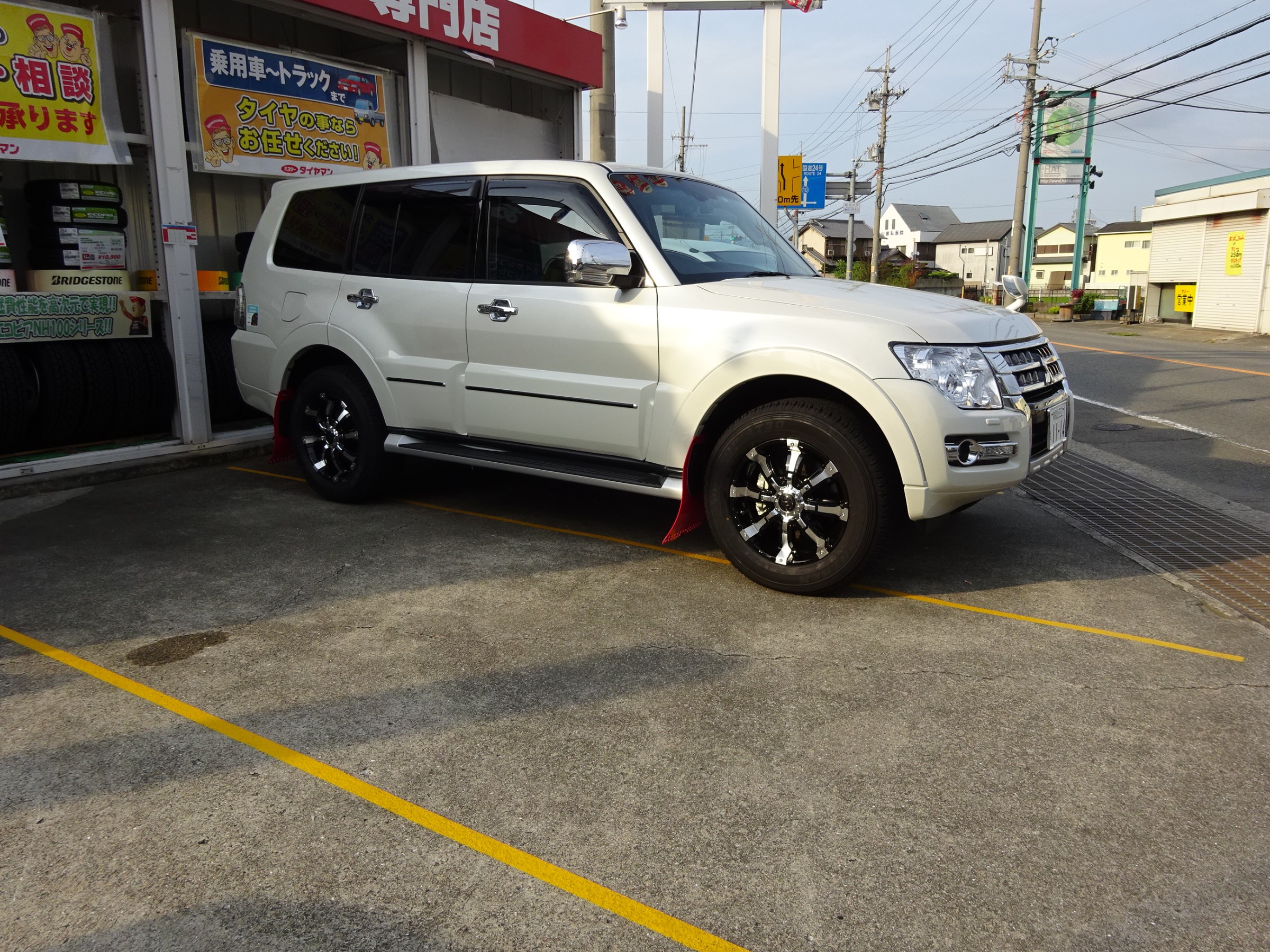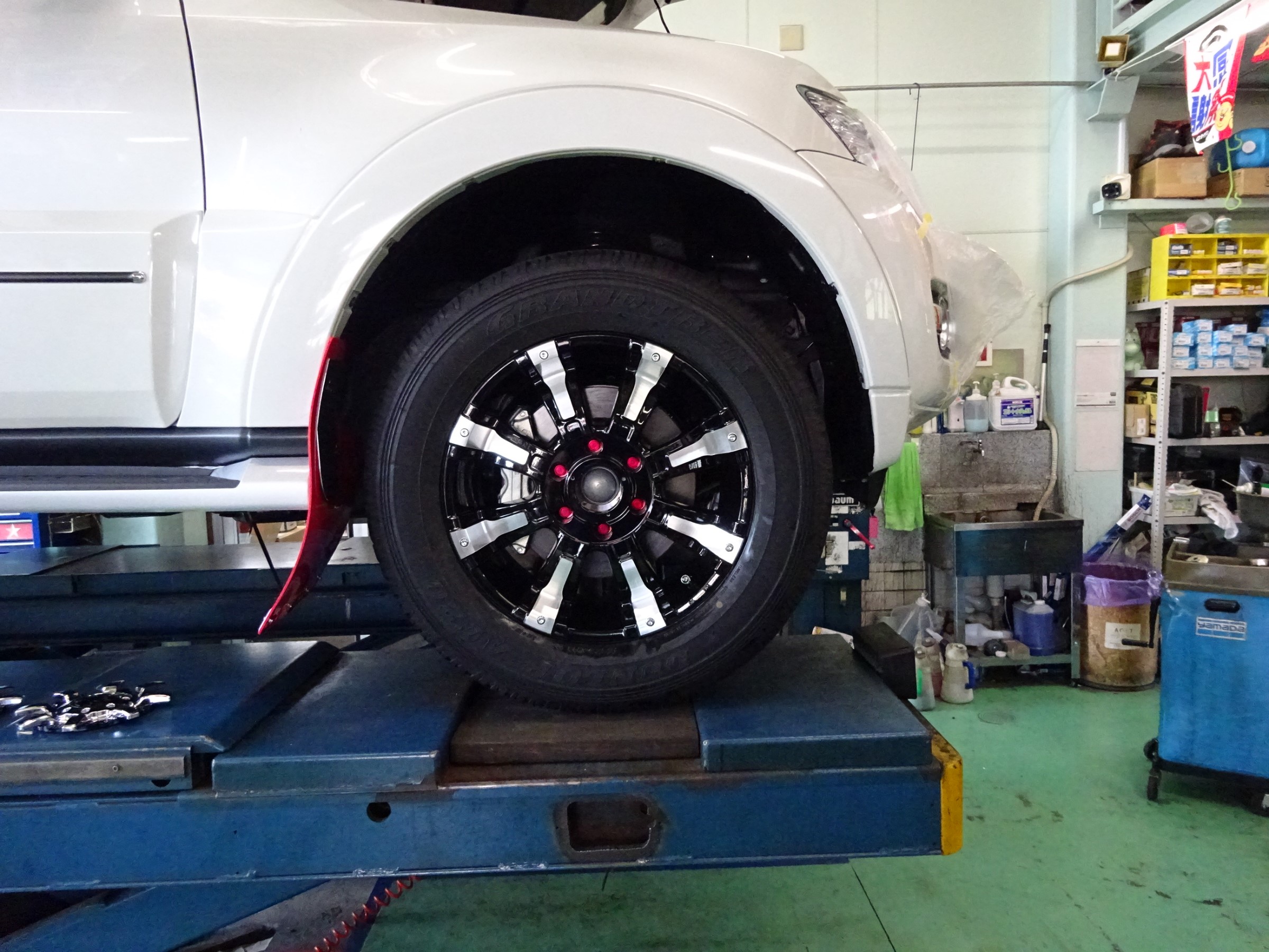 新型パジェロのお客様の依頼で、ホイールをクリムソン ビースト ナットにはキョーエイ産業の赤