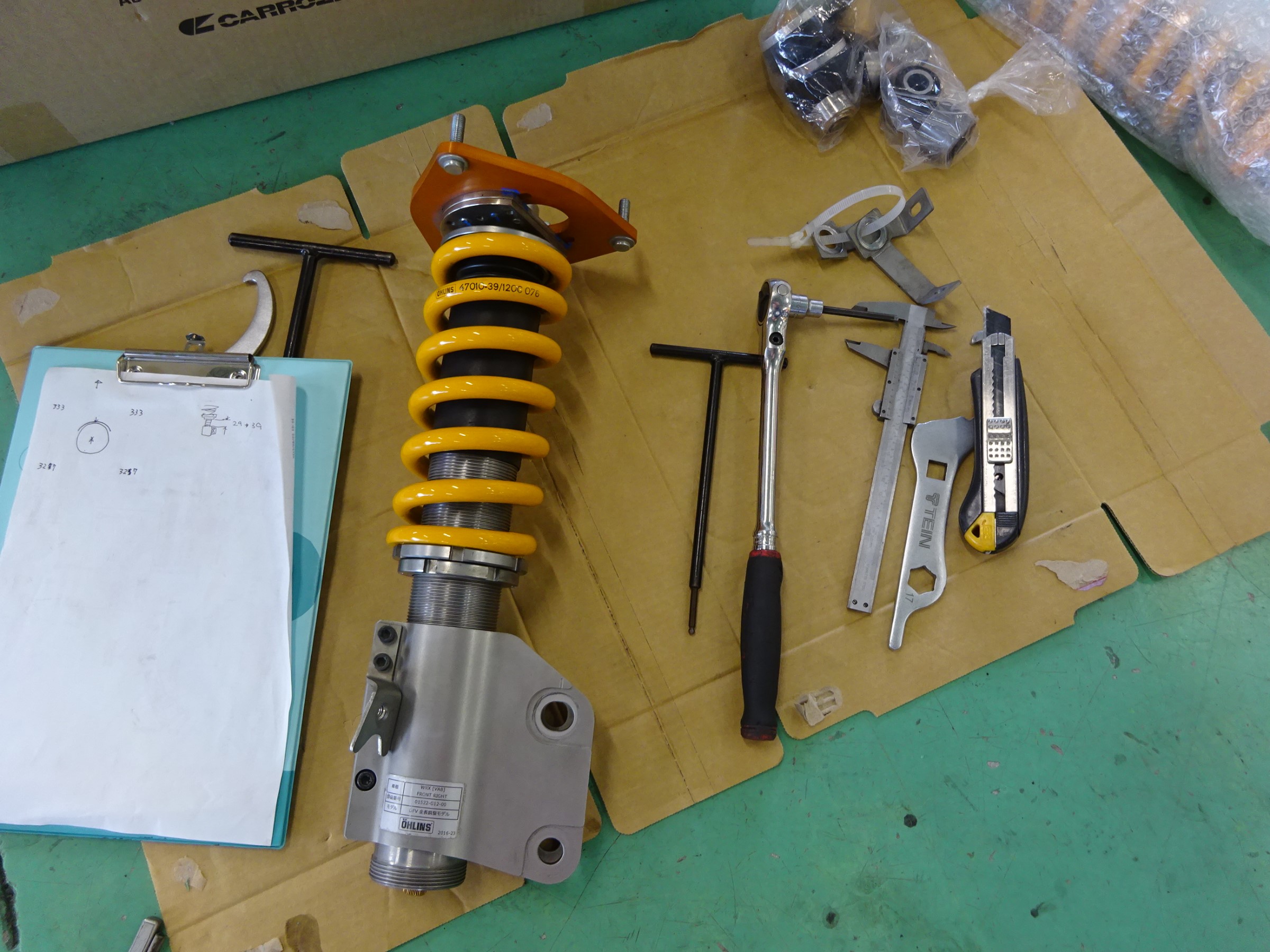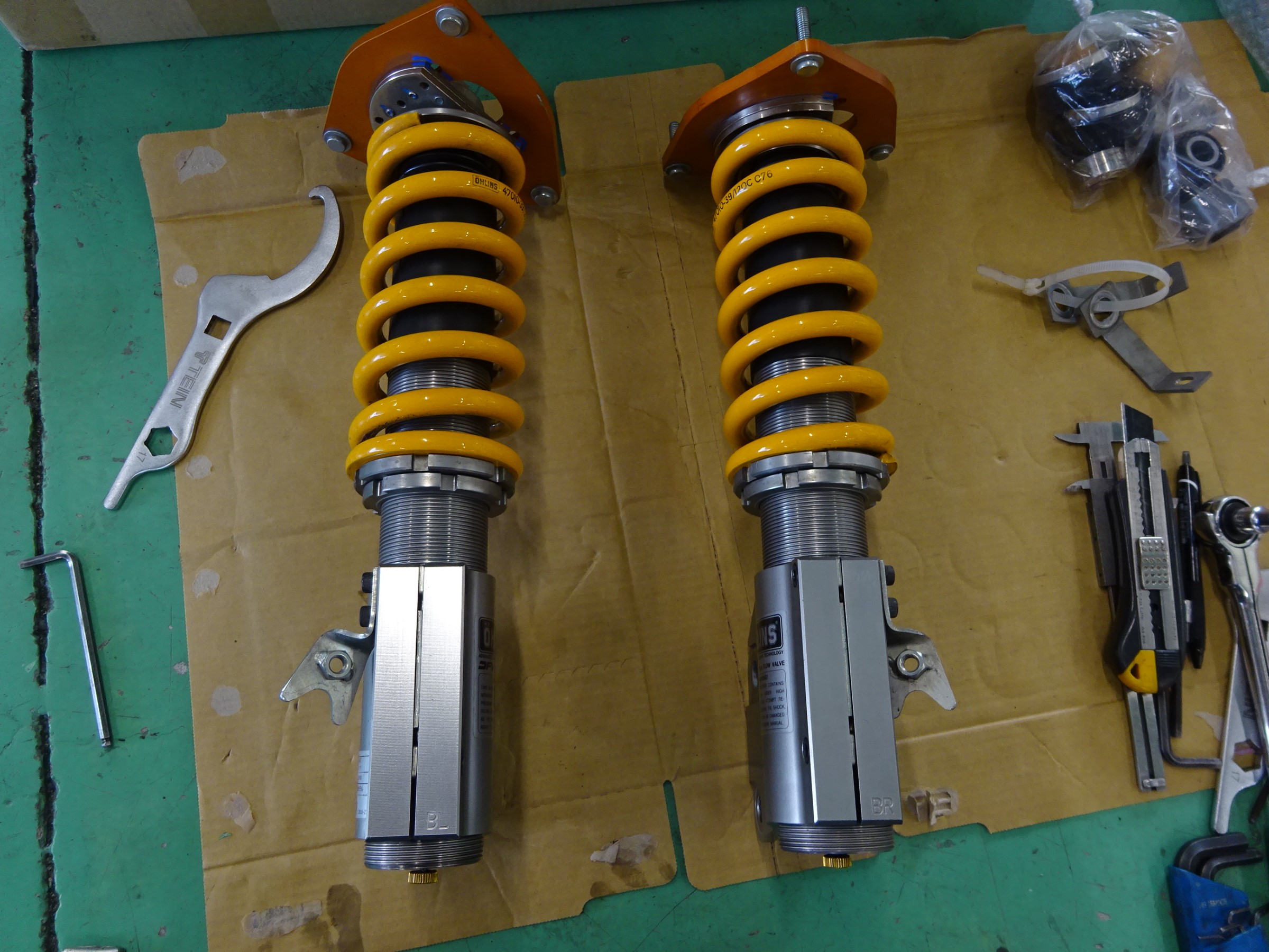 届いたオーリンズのサスペンションに交換です。