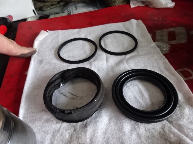 先日点検で発見した、ブレーキキャリパーのブーツが焦げて、穴が開いていたので。