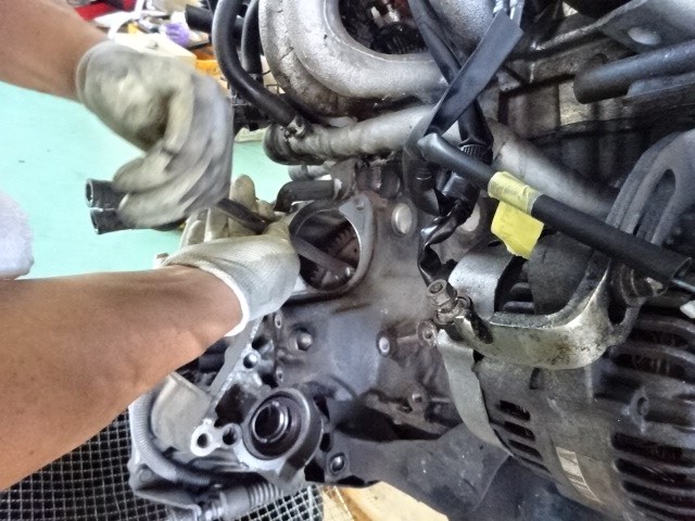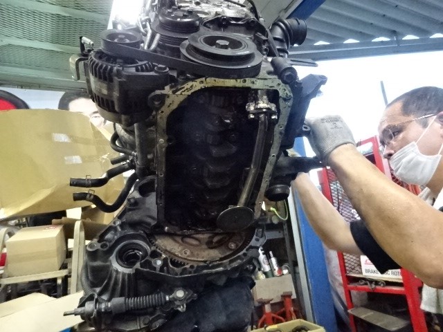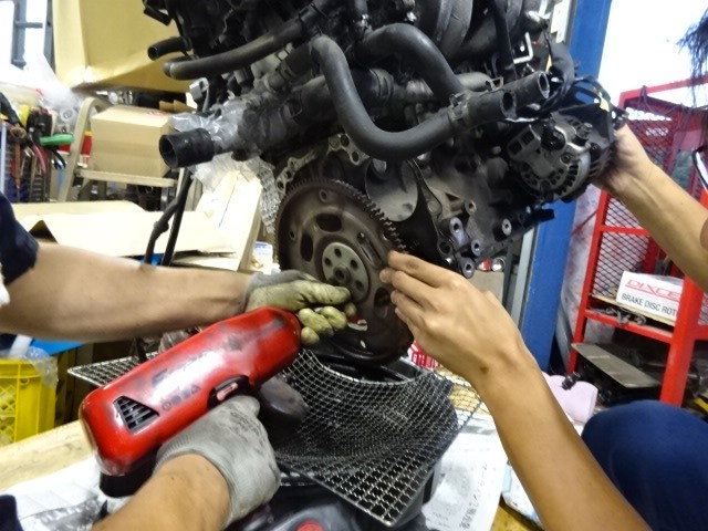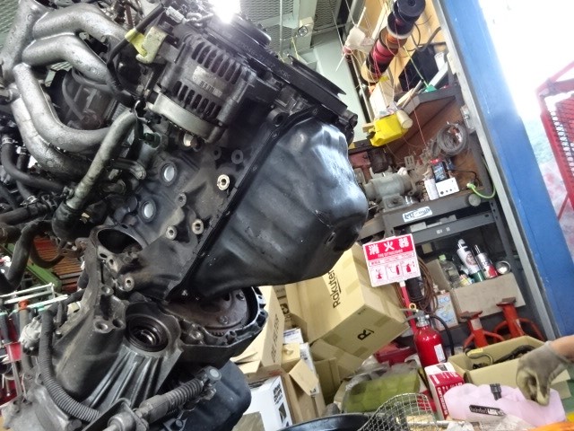 ATなので、トルクコンバーターとフライホイールを分離しとかなくては、ならないのですが、このボルトが硬く角度が悪いので、オイルパンを外さなくては、なりません。