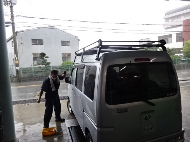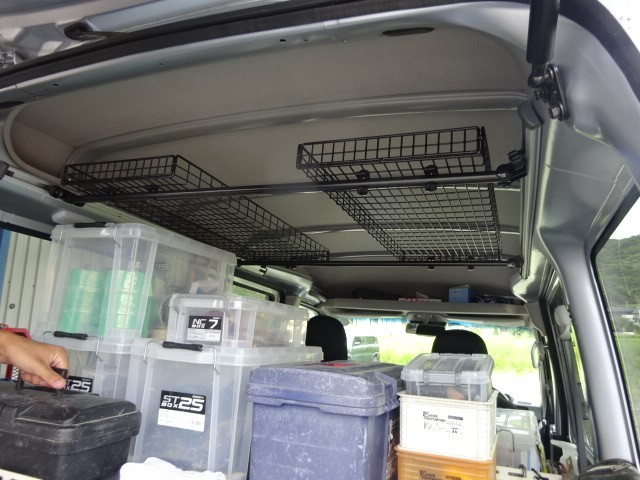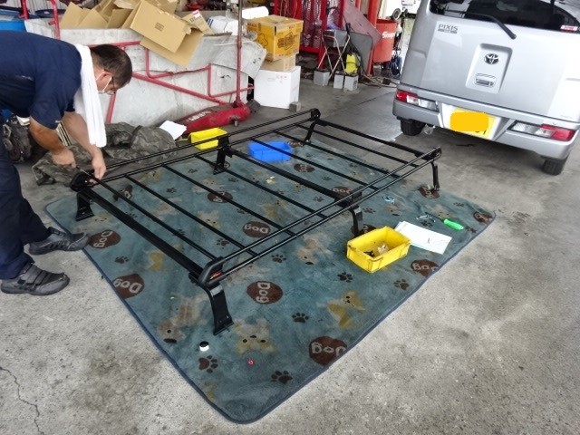 お仕事用のハイゼットバンに室内のキャリアとルーフキャリアの取り付け作業です。