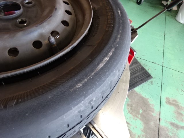 タントのお客様、パンクでご来店診ると、エアーが少ない状態で長く走行していた為、サイドウォールが、摩耗が進んで穴が開いた状態でした。