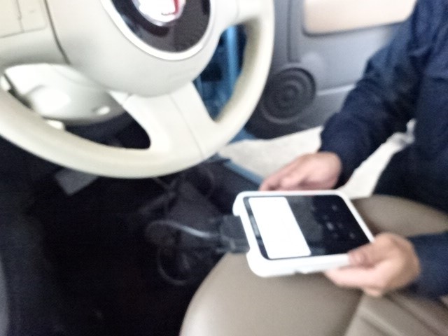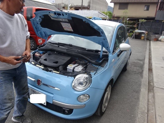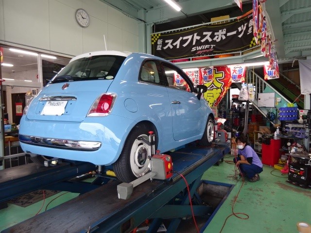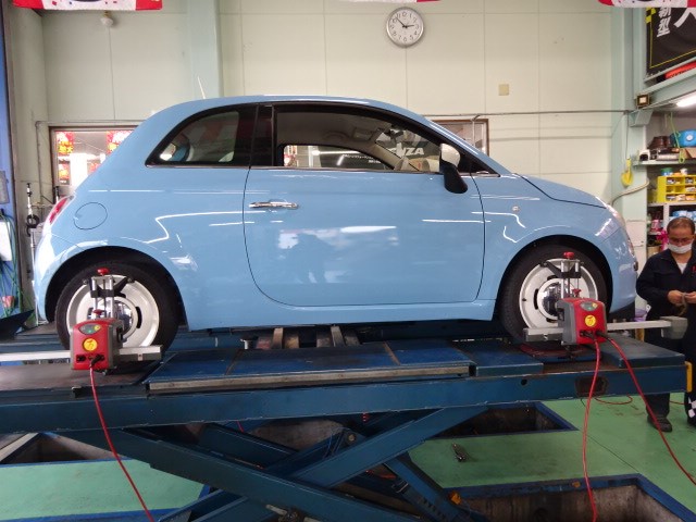 業者様からの依頼で、FIAT500のアライメント調整です。可愛いですね。