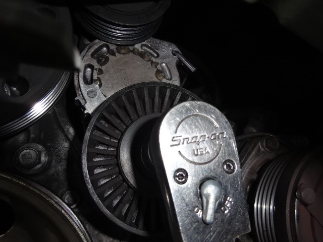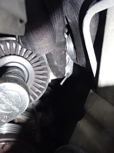 オートテンショナーをストッパーでロックしてベルト取り付けます。