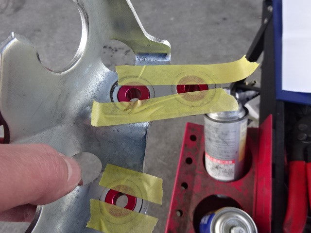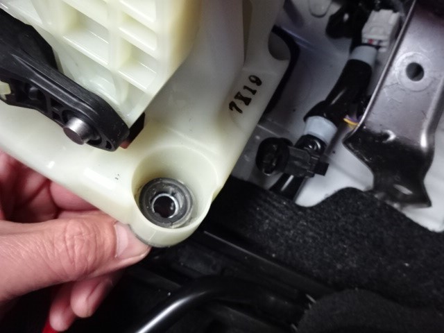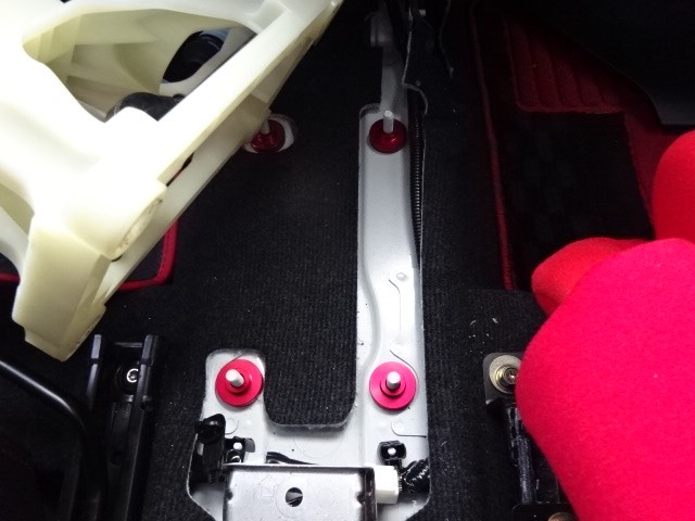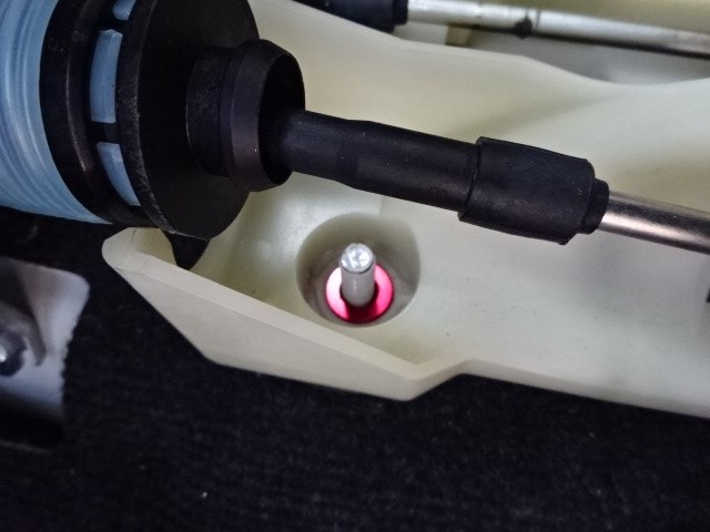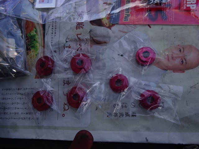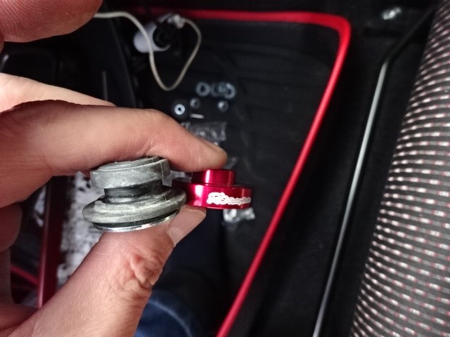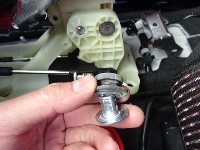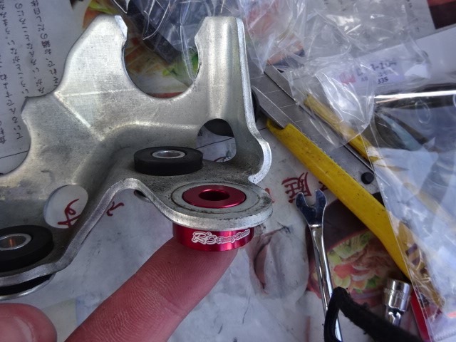 緩めたナットの下のゴム製ブッシュをアルミ製に交換します。