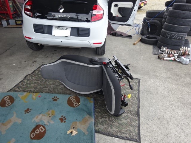 ツインゴのお客様、「シートのヤレが気になるので交換してくれ」との事で、極上の中古シートが有ったので、交換します。
