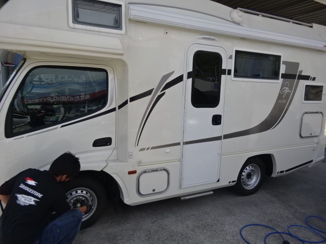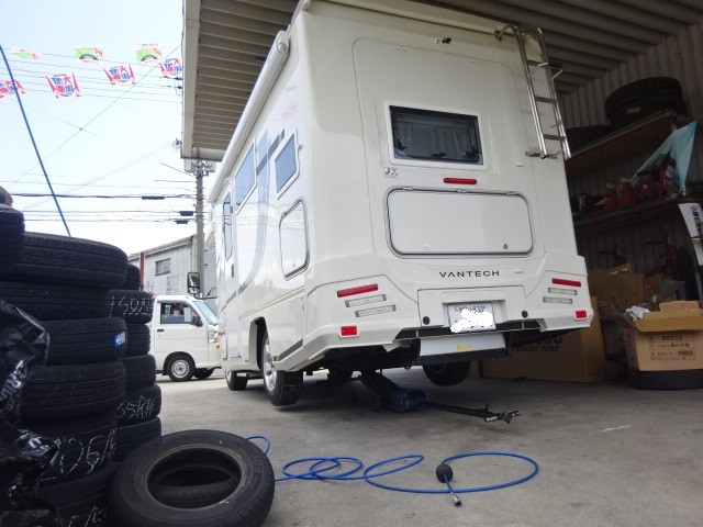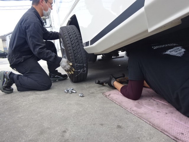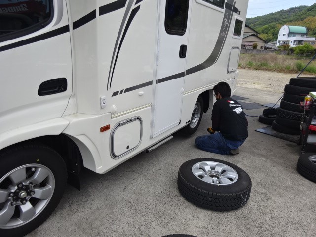 キャンピングカーのお客様、ご自身で夏タイヤに脱着出来ず、持ってこられました。