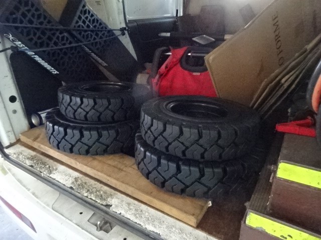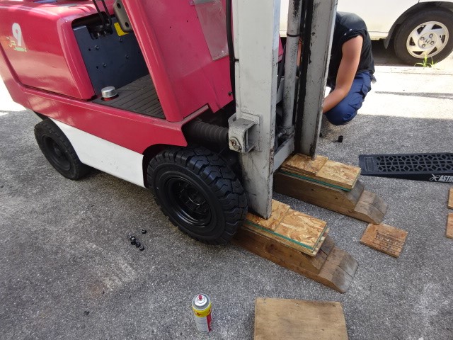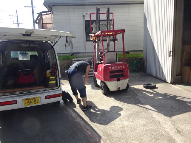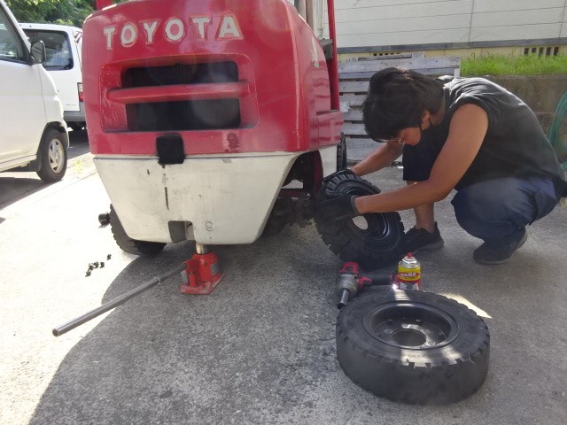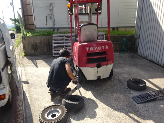 先日バッテリー交換に出張した、フォークリフトのタイヤ交換です。