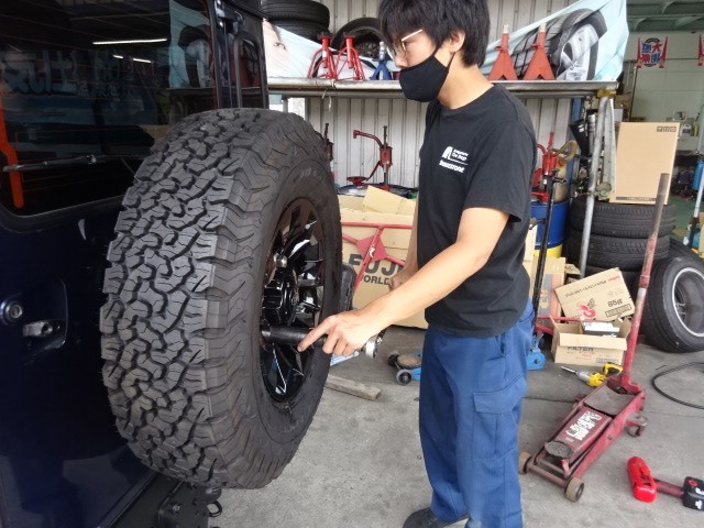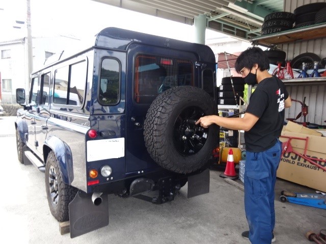 作業中にランドローバーディフェンダーのホイール交換が入ります。
