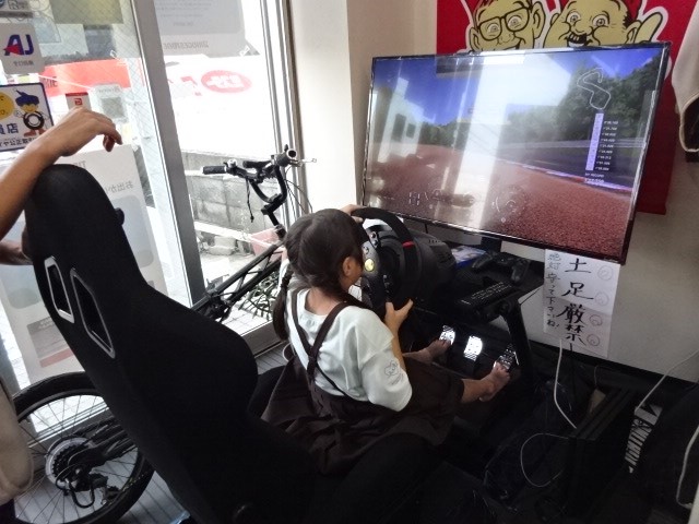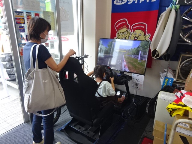 パンク修理まちの親子レースシュミレーターに興味を持ってもらいGO~