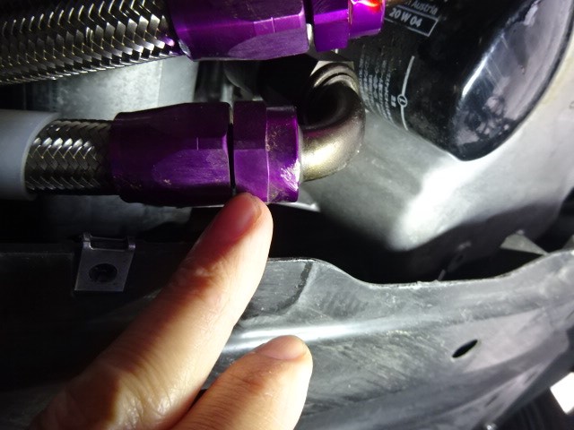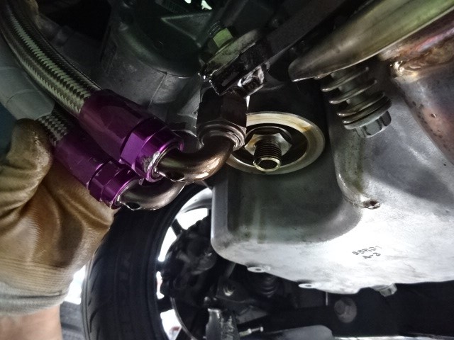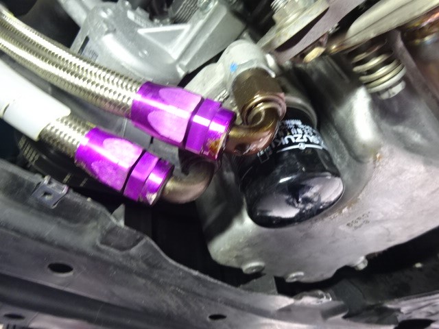 開けて診るとオイルクーラーのジョイント辺りから漏れていますね?