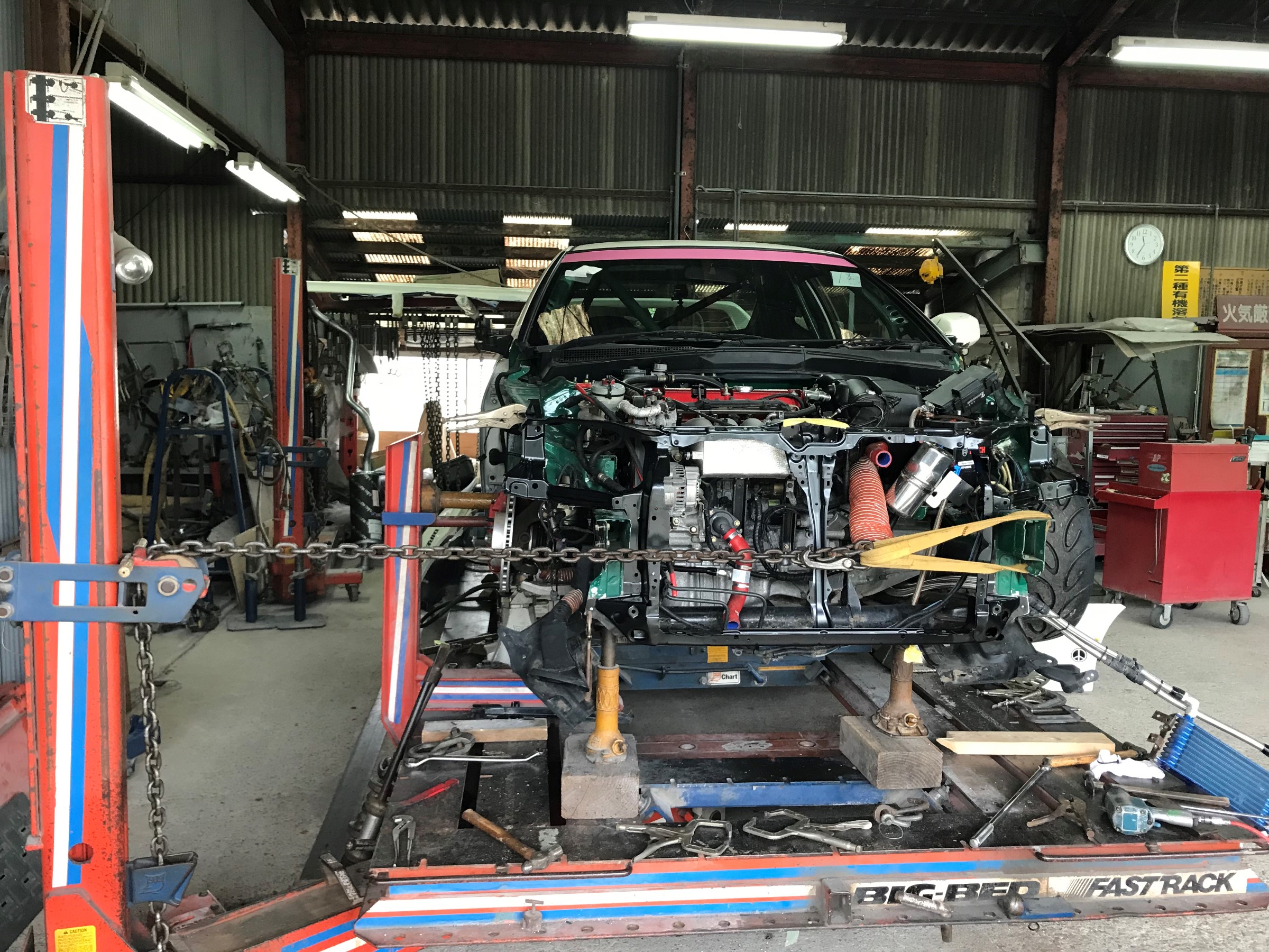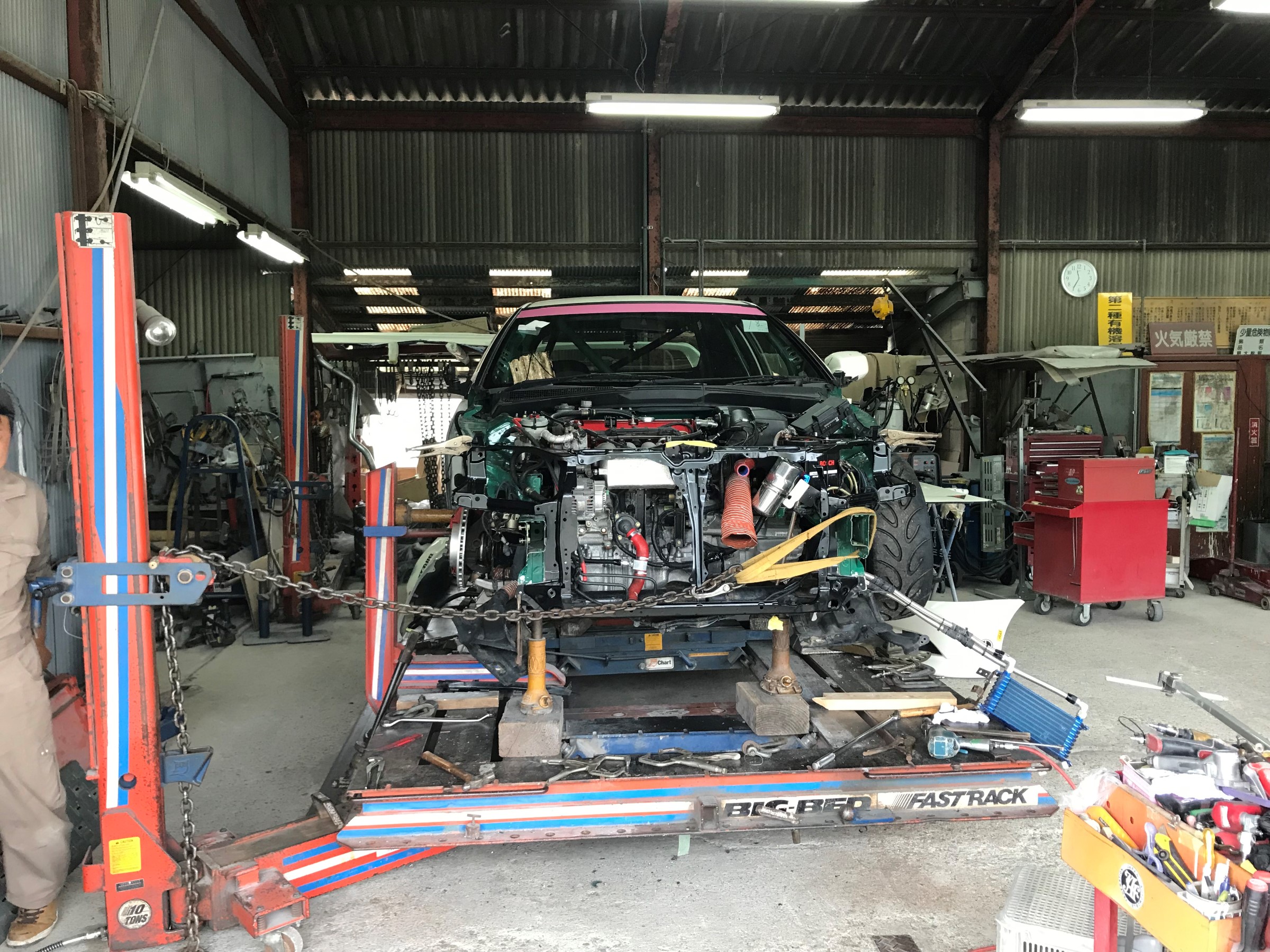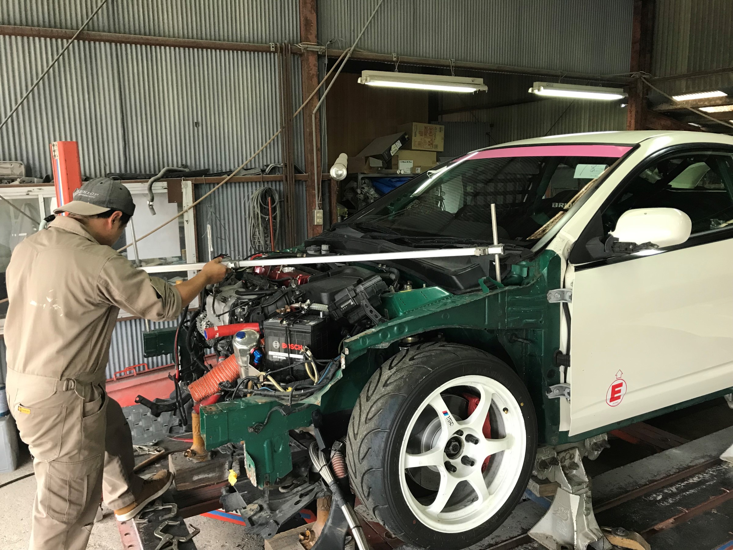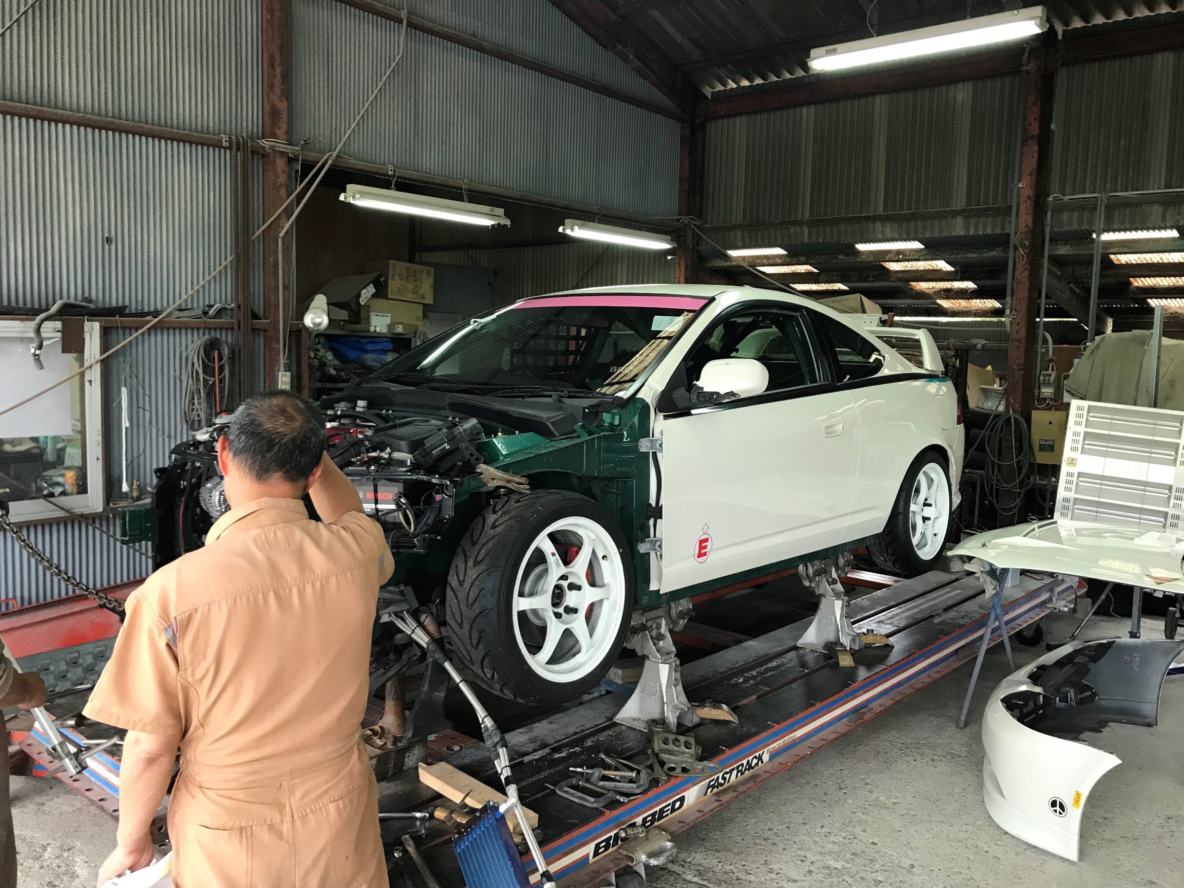 先日 鈴鹿ツインサーキットにて、クラッシュした、DC5 知人(達人)の鈑金屋さんに入庫したと情報が入ったので、手土産持って挨拶に・・・