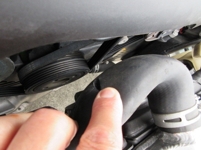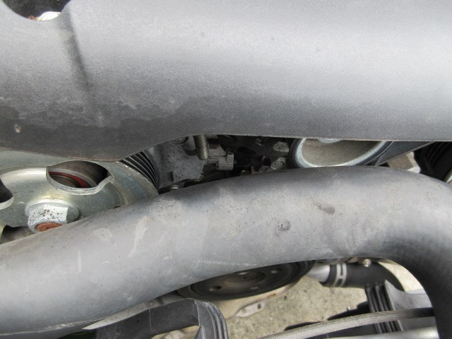 診てみるとラジエーターアッパーホースがオルタネーターのプーリに接触した痕が・・・