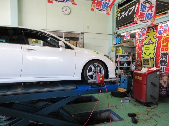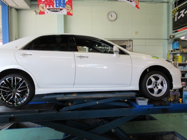 業者様からの依頼で、クラウンアスリートのアライメント調整です。新品のホイールなので、ダミーホイールを付けて、調整に入ります。
