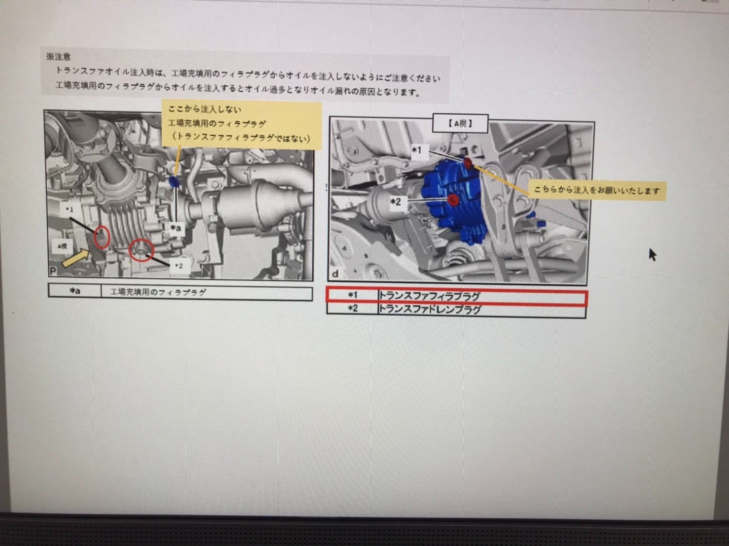 トヨタに確認してみるとオイル漏れの事例は無いですが、違う注入口から注入して、入れ過ぎの為に、吹き出す。事が有るそうです。