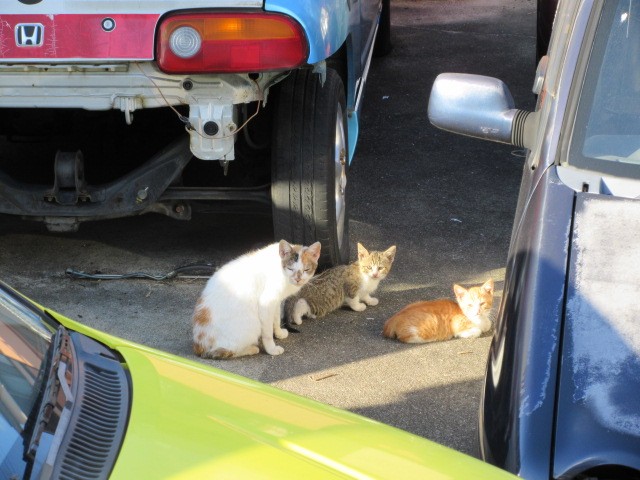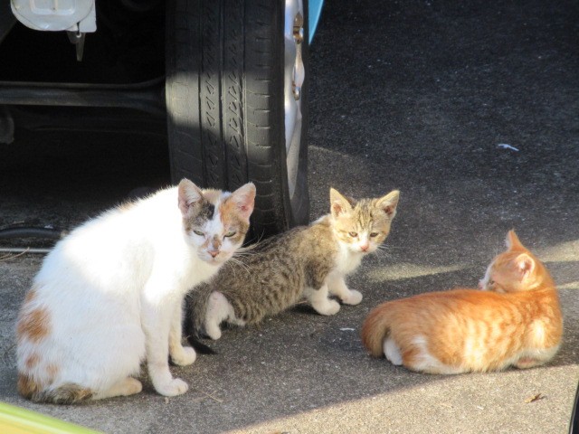 ガレージの車置きにニャンコ親子の日向ぼっこ・・・