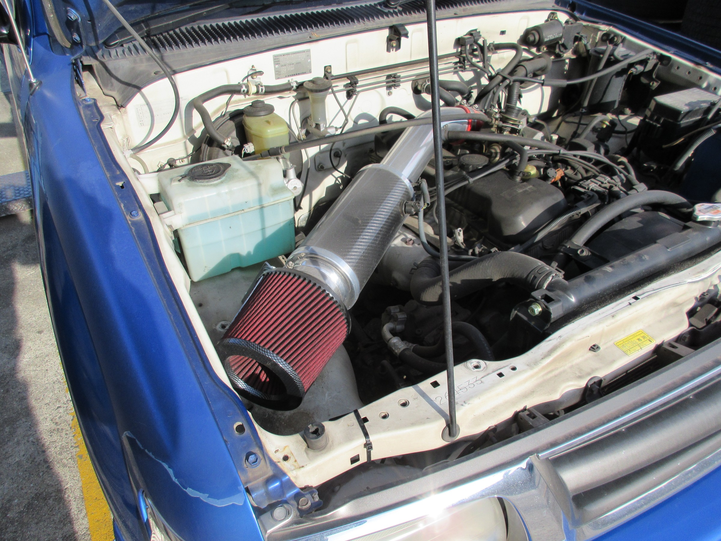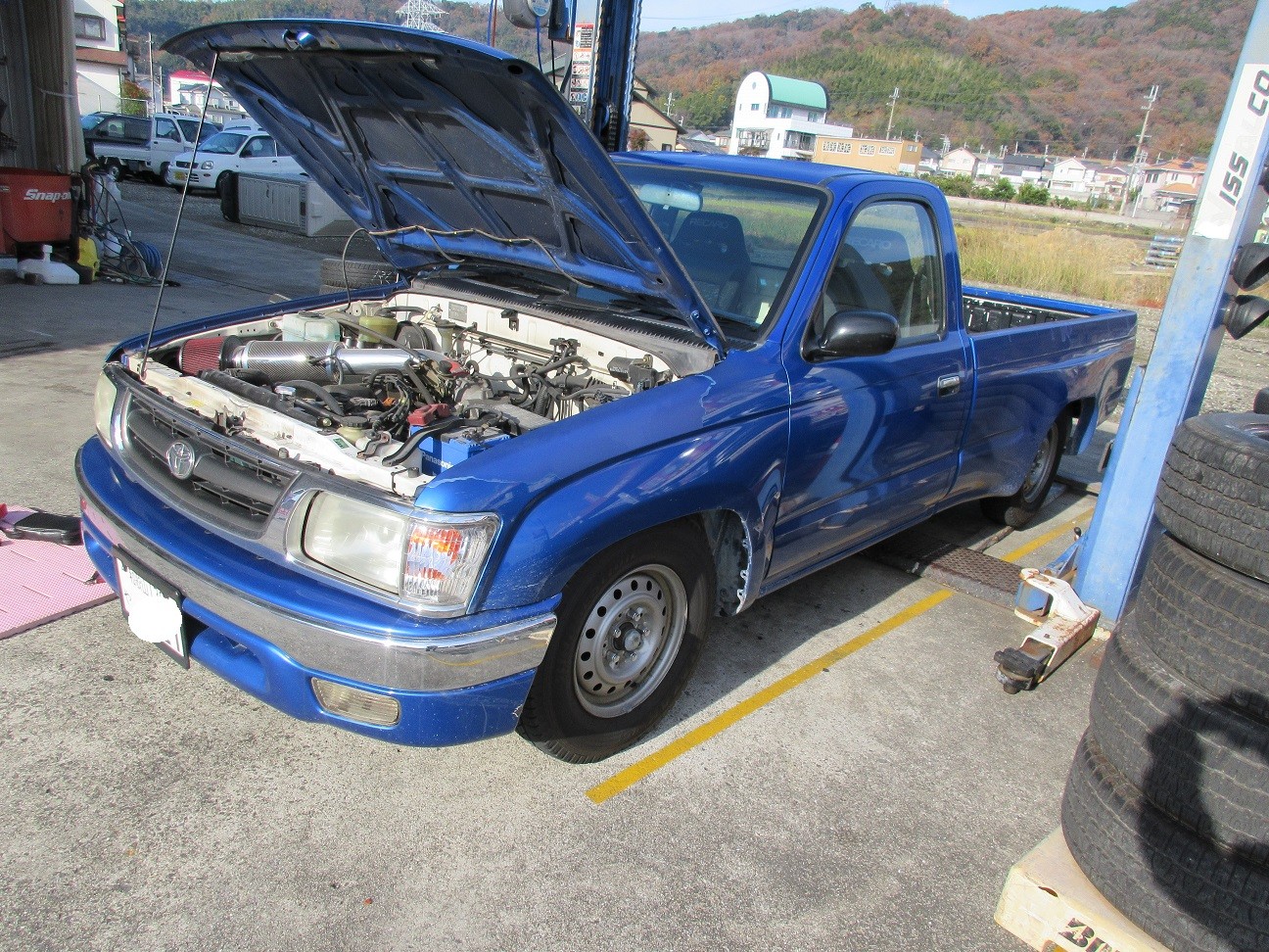 ハイラックストラックの車検整備です。オーバーフェンダー付いて車高が低いですが、公認だそうです。