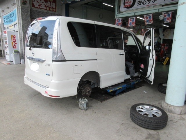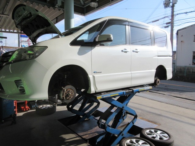 セレナの車検整備です。サクサクっと仕上げます。