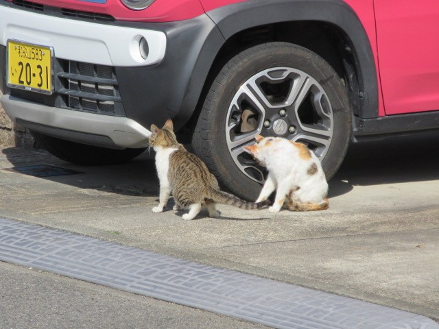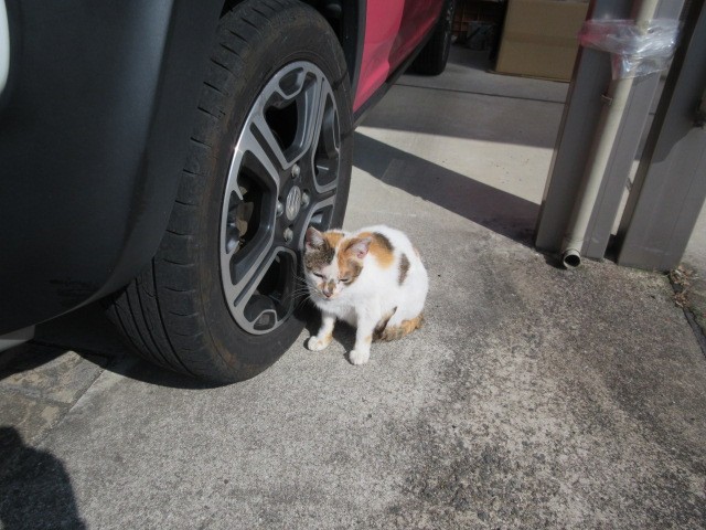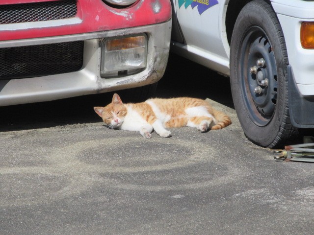 ニャンコが日向ぼっこ「車の上にのるなよ」乗ったらシバク(翻訳すると可愛がる)