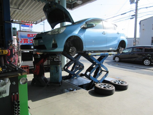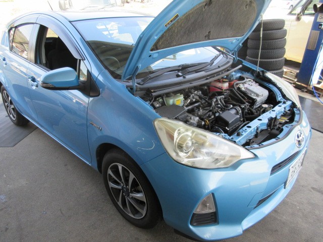 アクアの車検整備です。ハイブリットも慣れたものですね。