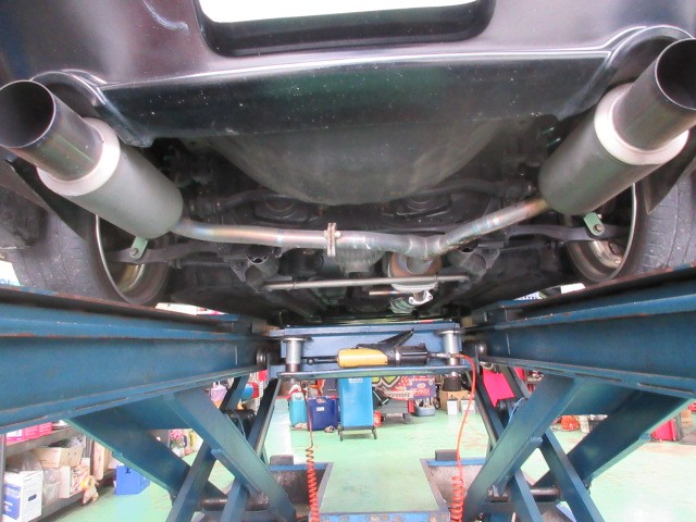 リフトで上げて診てみると、チタンのカッコいいマフラーが付いてますね。