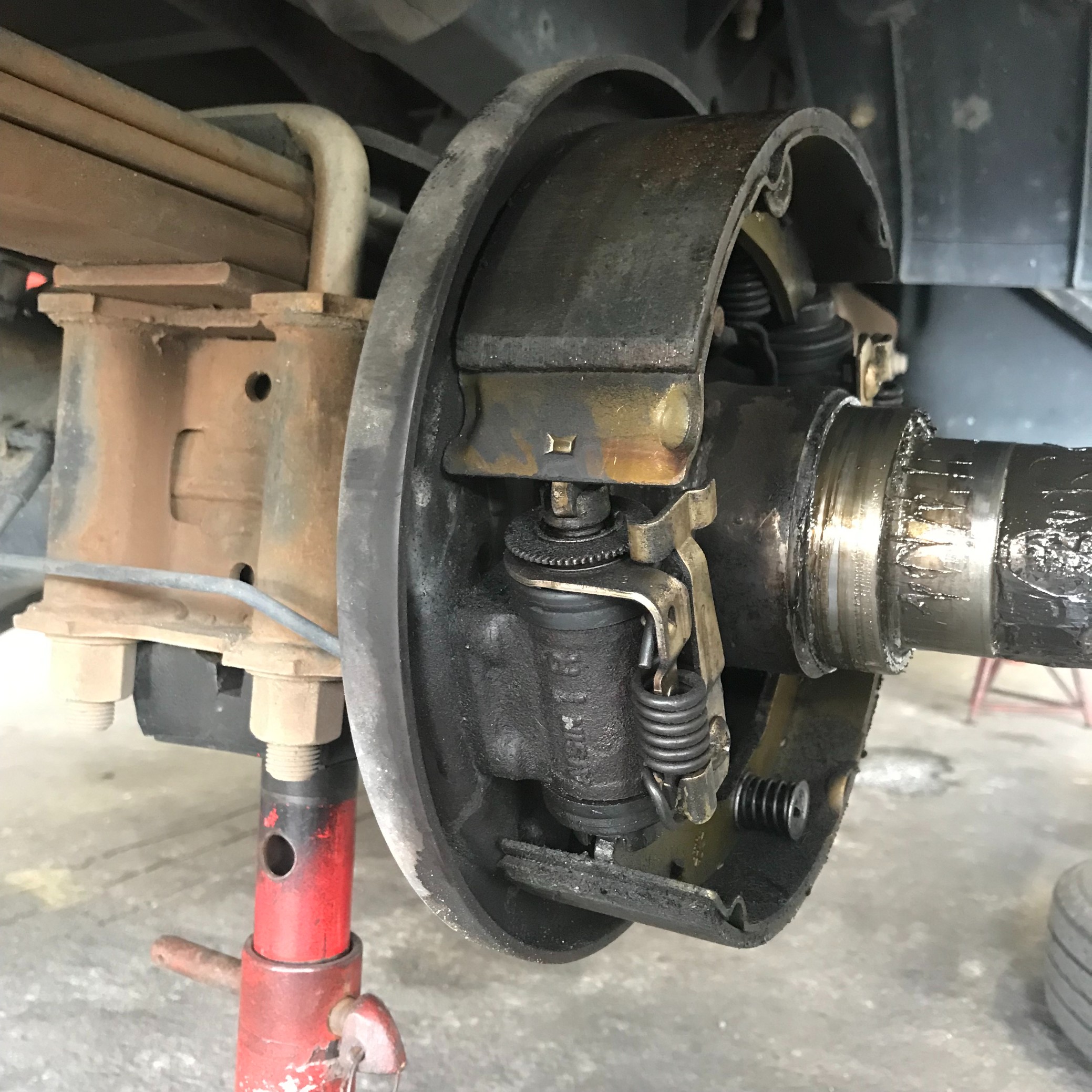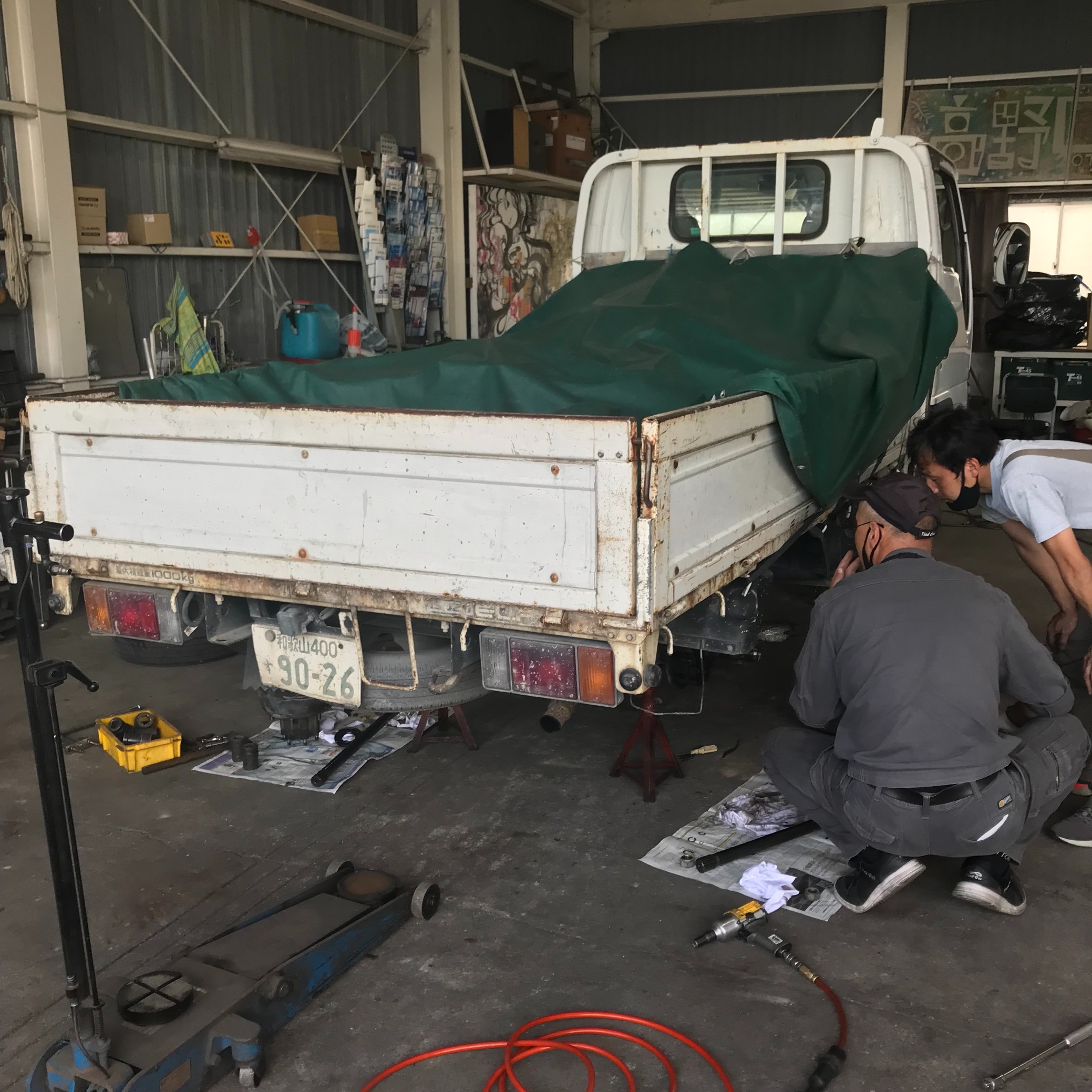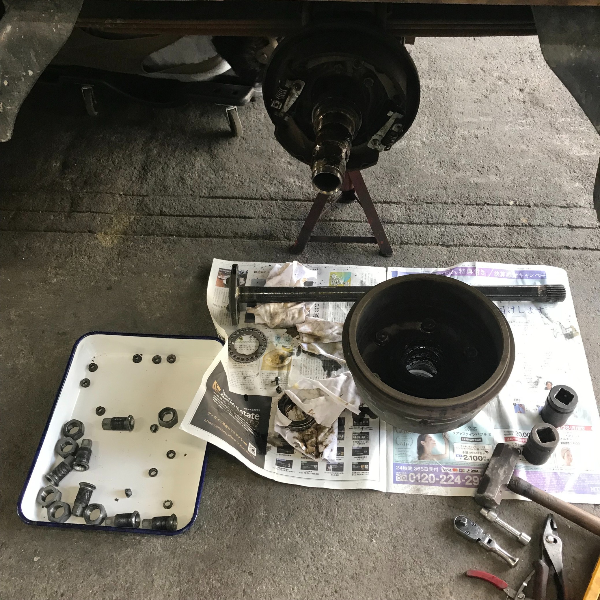 今日の本題のトラックのリアブレーキの片効きの修理を工場に持ってきました