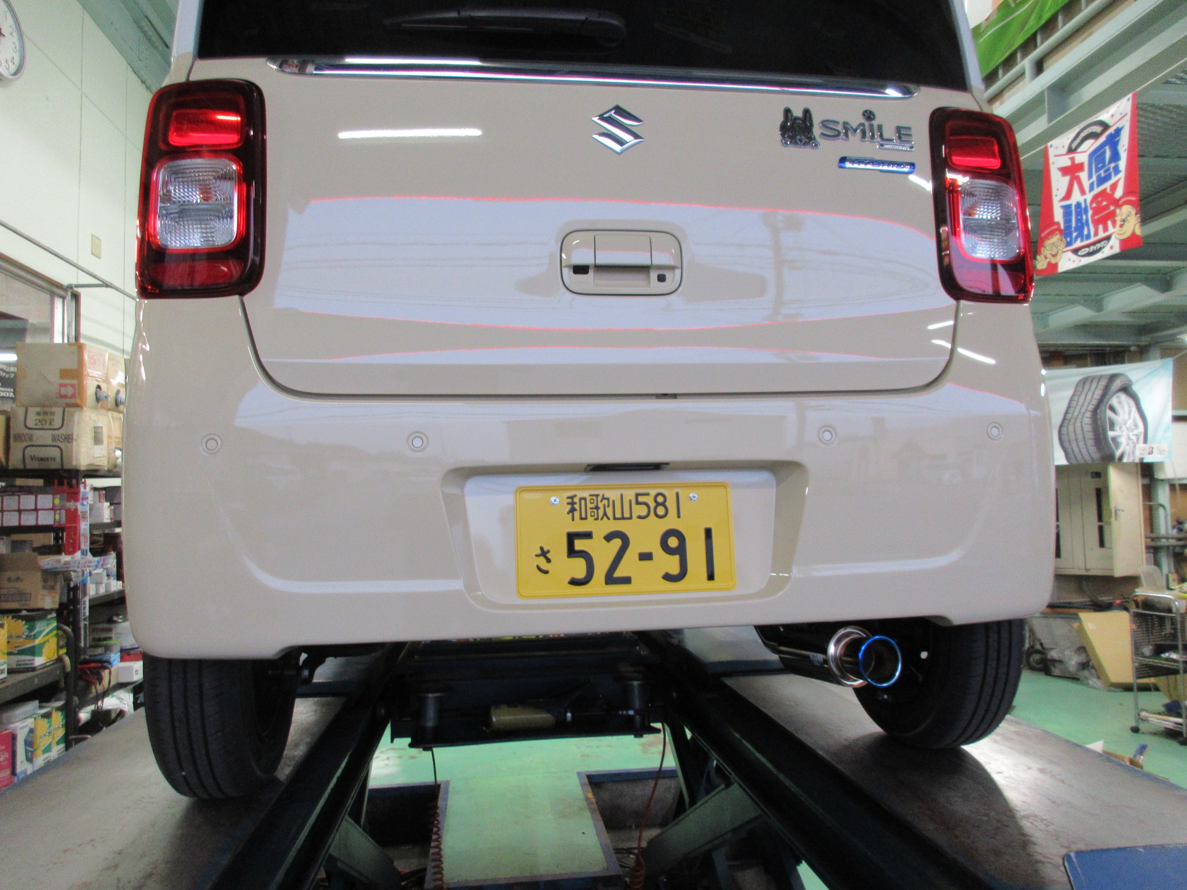デモカーのワゴンRスマイルのマフラーが完成したので、引き取りに来ましたよ。