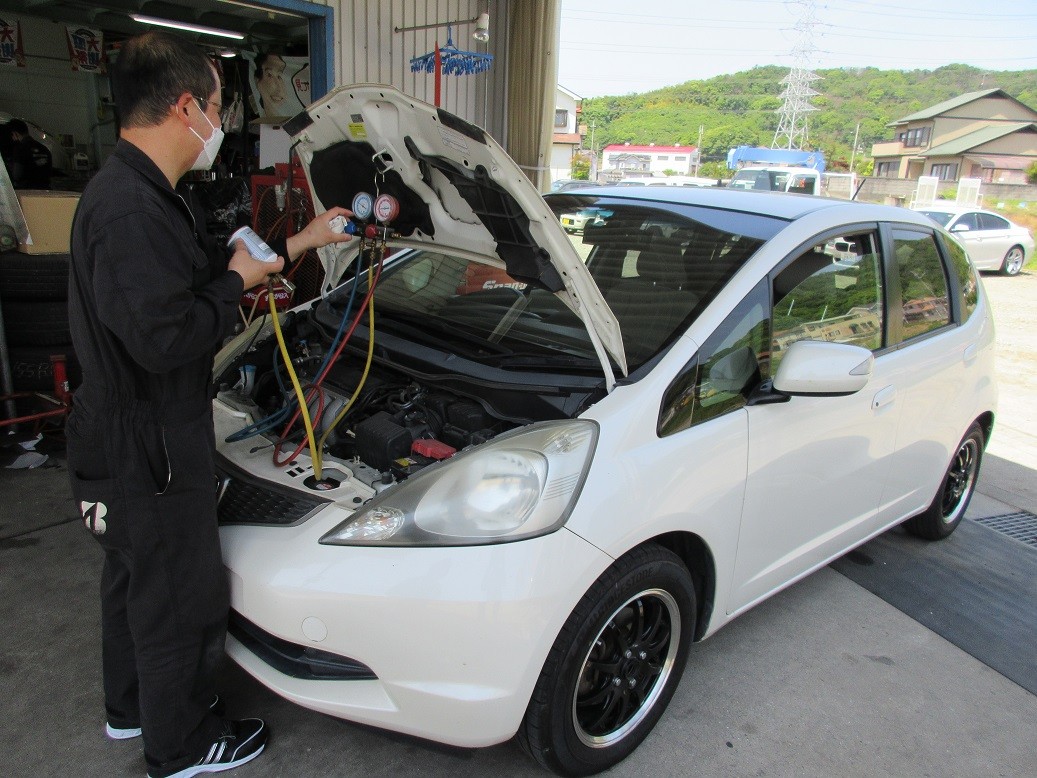 この季節がやって来ました。エアコンの効きが悪いので、ガスの点検です。