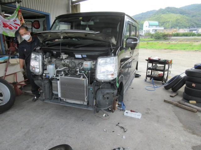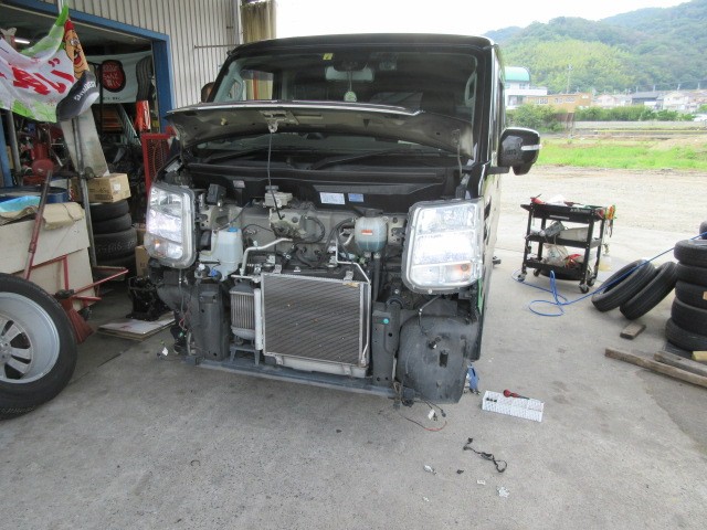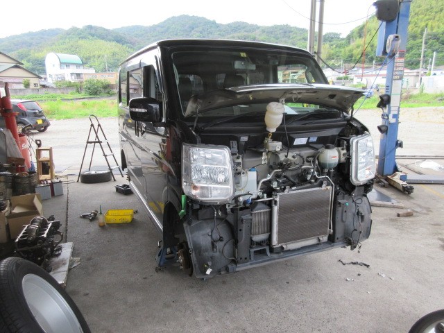 エブリイの車検整備です。雨なので、リフトに掛けられません。