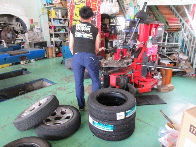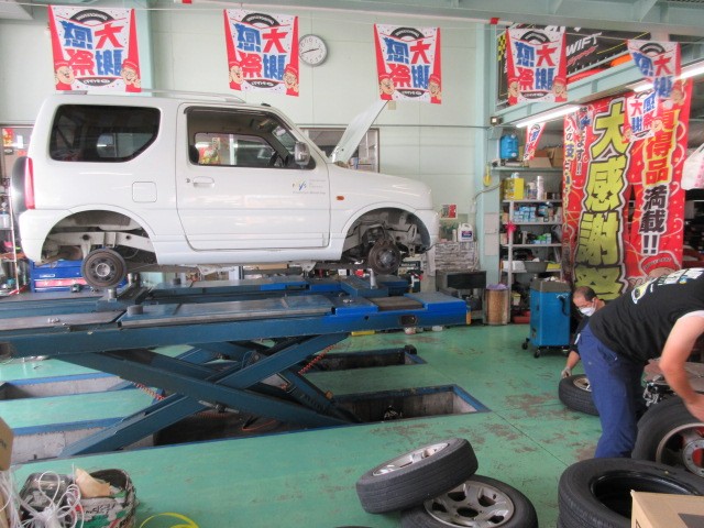 JB23ジムニーのタイヤ交換です。スズキ愛車無料点検もさせて頂きます。