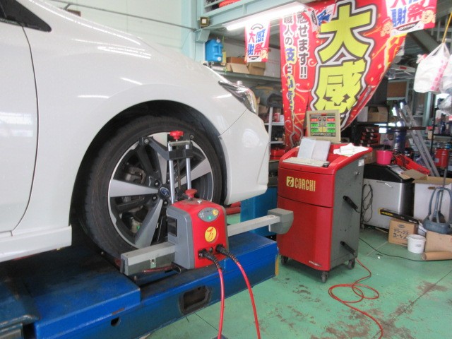 朝一業者様からの依頼で、縁石乗り上げバーストのアライメント調整・タイヤ交換の作業です。