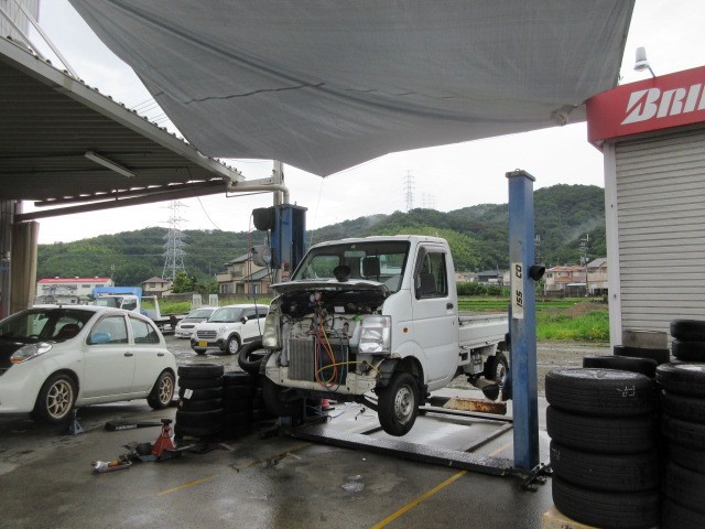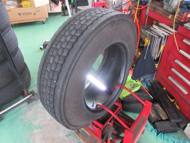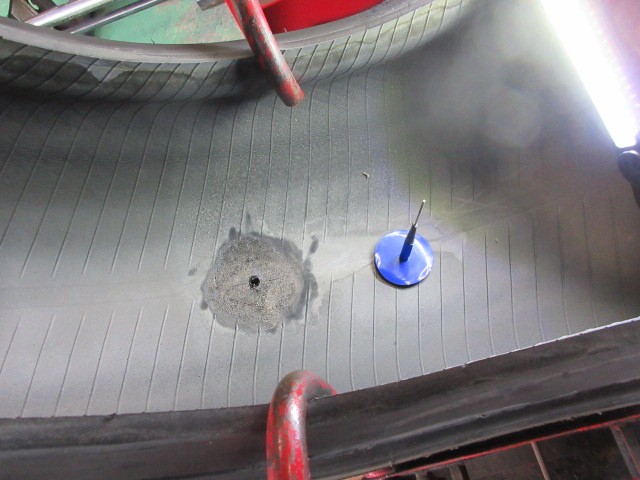 トラックのパンク修理です。穴が大きいので、埋めて行きます。