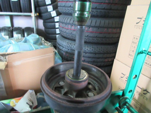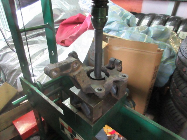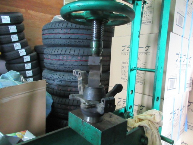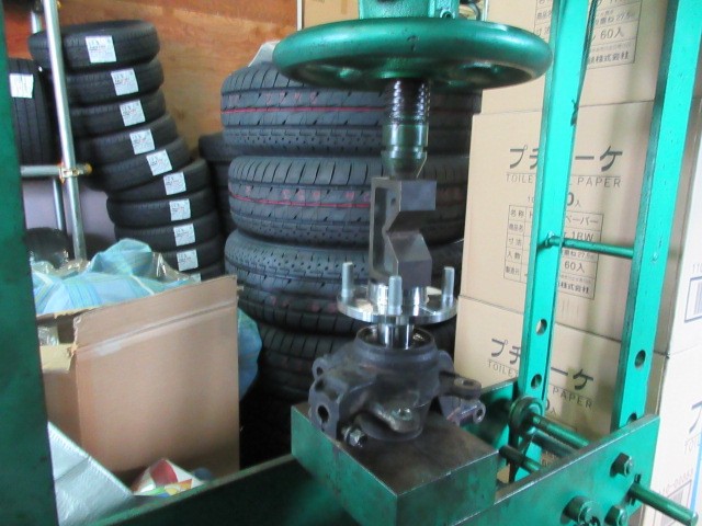 丁度良い治具が無いので、工場に有るものすべて使います。ホイールバランサーのコーンで押します。