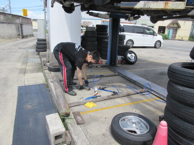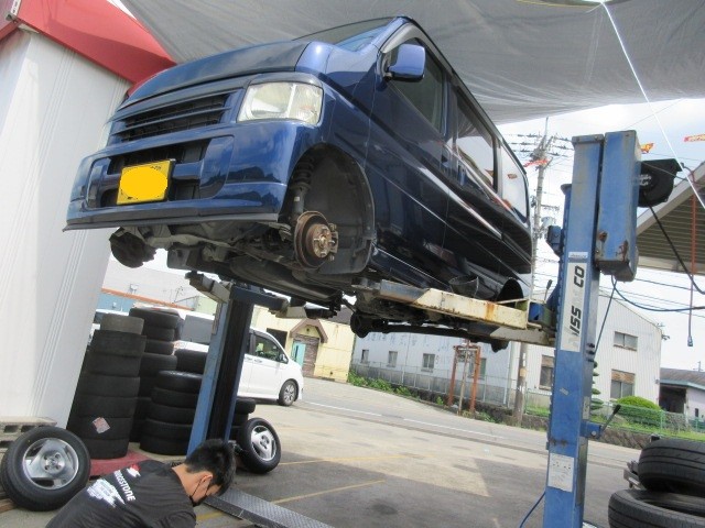 バモスの車検整備です。ぼくが、負傷を負ったので、次男が会社を休んで手伝ってくれています。