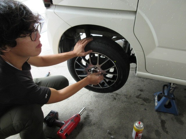 タイヤ交換は、進んで行きます。お客様と相談して、お車を預かりボルト交換致します。
