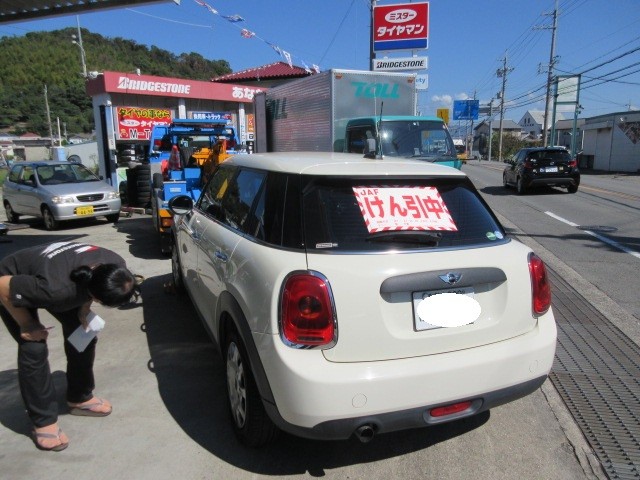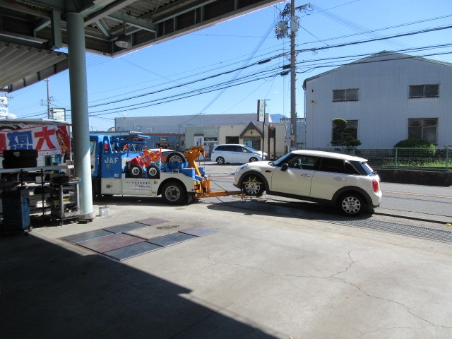 いきなりJAFさん、ご来店・・・ミニが引っ張られてきました。